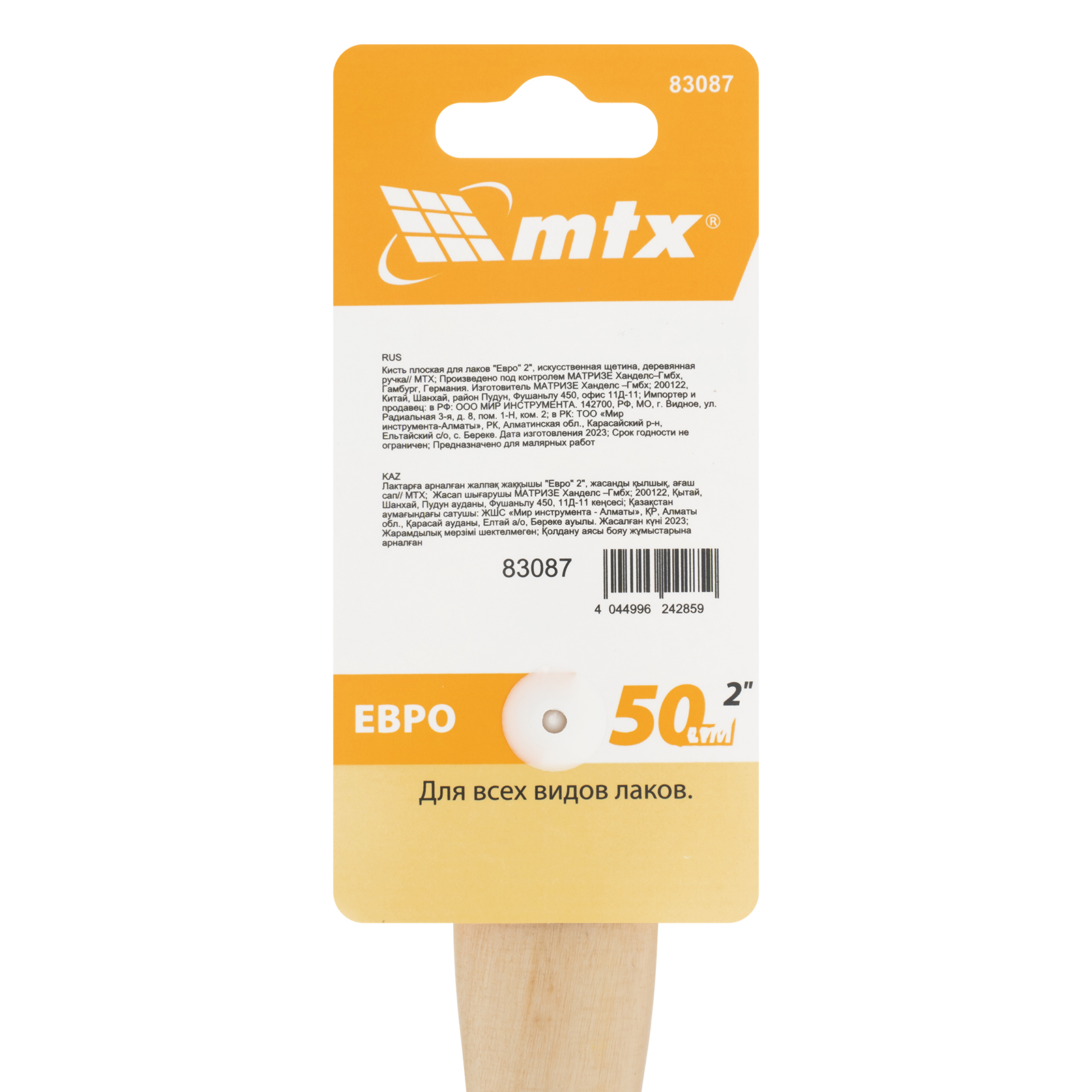 Кисть плоская для лаков "Евро" 2", искусственная щетина, деревянная ручка MTX