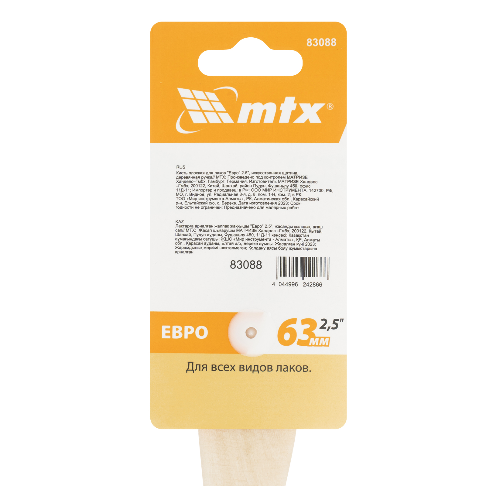 Кисть плоская MTX «Евро» 83088 шириной 2,5", с искусственной щетиной и деревянной ручкой, пригодится при проведении малярных работ. Предназначена для работы с любыми типами лаков. Мягкая и упругая щетина оптимальна для нанесения покрытий на гладкие и слегка шероховатые поверхности.