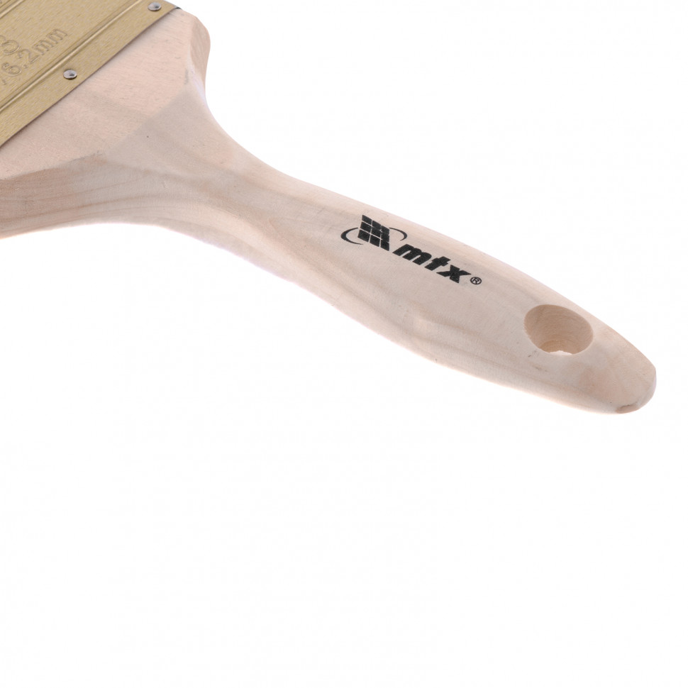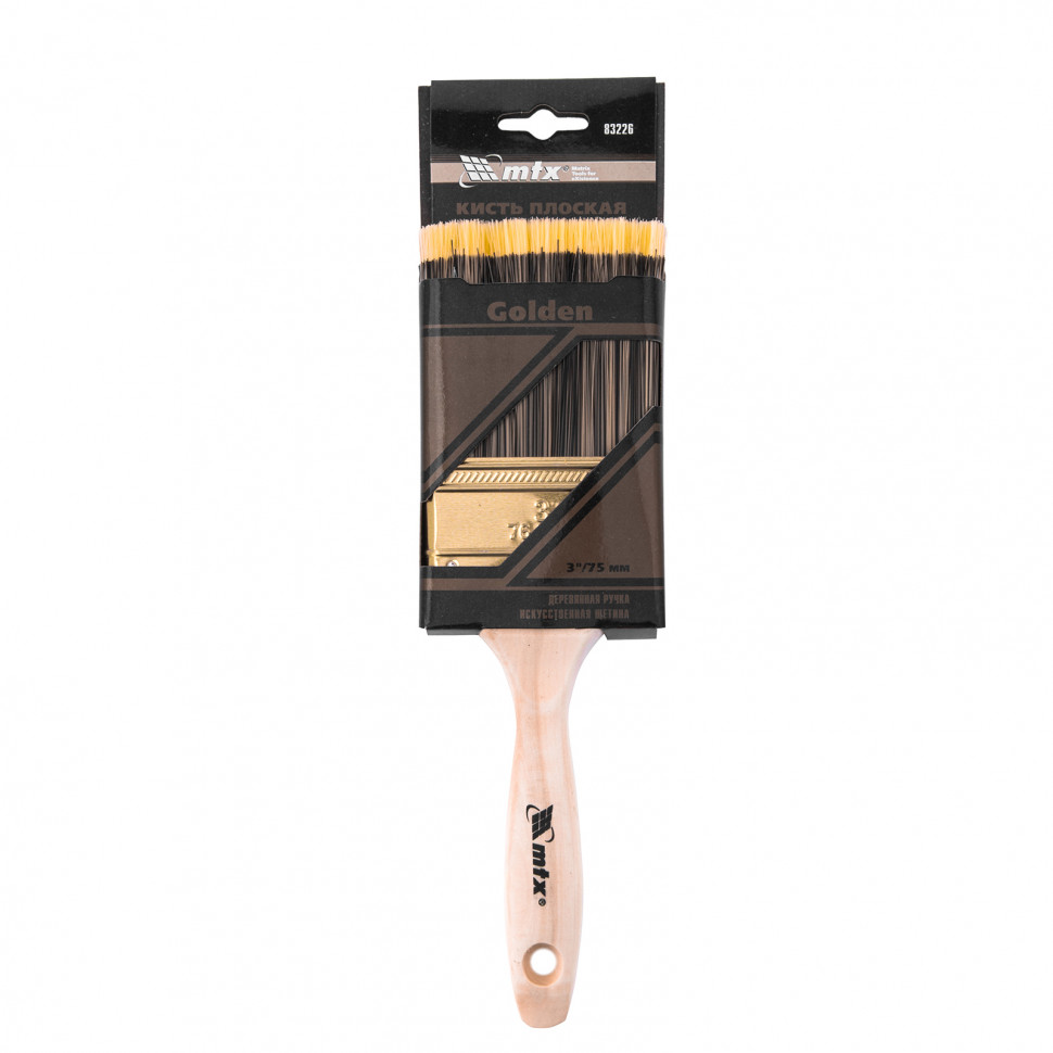 Плоская кисть MTX Golden 83226 шириной 3 дюйма, с искусственной щетиной и деревянной ручкой, используется для проведения малярных работ. Подходит для нанесения красок на водной основе, т.к. синтетическое волокно не теряет формы и упругости при работе с ними. Кисть с жесткой, полой внутри щетиной отлично впитывает и отдает краску, эффективно окрашивает грубые и неровные поверхности.