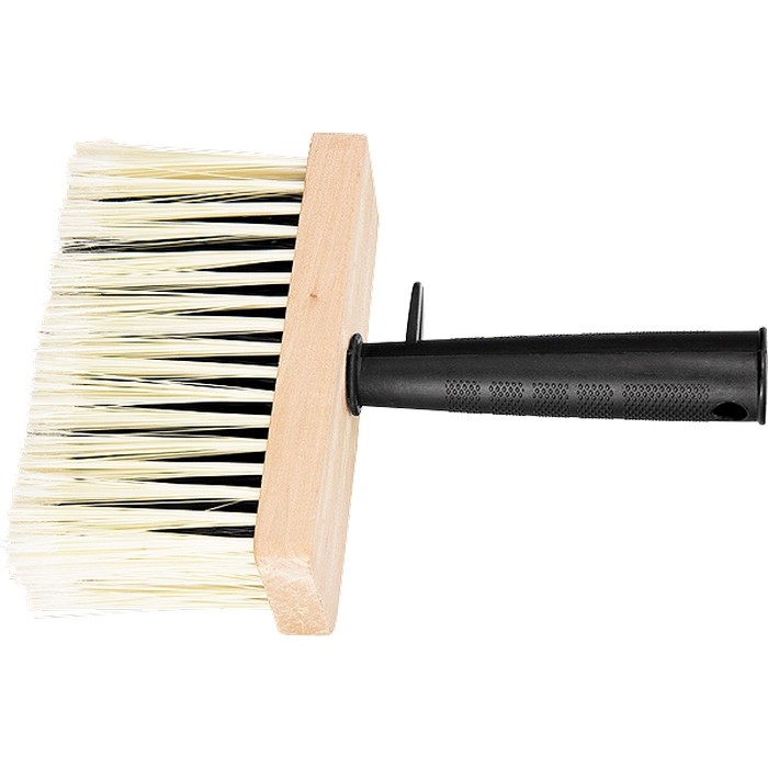 Кисть-макловица MTX 84084 шириной 140 мм и толщиной 52 мм, с искусственной щетиной, деревянным корпусом и пластмассовой ручкой, предназначена для нанесения лакокрасочных материалов и клеевых составов на участки большой площади — стены, потолки, фасады. Искусственный ворс не впитывает воду и устойчив к растворителям, поэтому кисть подходит для работ с грунтовками, лаками, водно-дисперсионными и масляными красками.