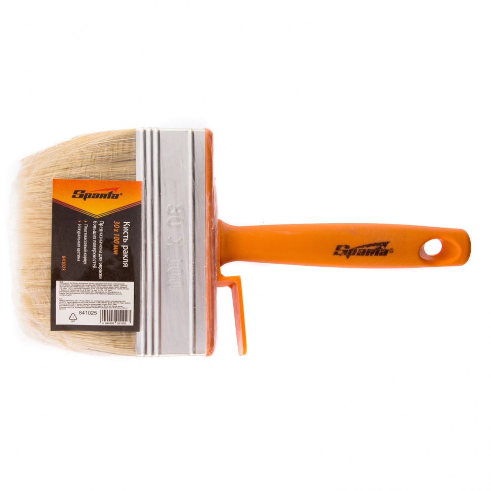 Кисть-ракля Sparta 841025 толщиной 30 мм и шириной 100 мм, с натуральной щетиной, пластмассовыми корпусом и ручкой, используется для малярных работ на участках большой площади, поэтому удобна для обработки стен, потолков и фасадов. Натуральная щетина устойчива к химическому воздействию, поэтому не деформируется и сохраняет упругость при работе с ЛКМ на водной основе, грунтовками, масляными красками и клеящими составами.