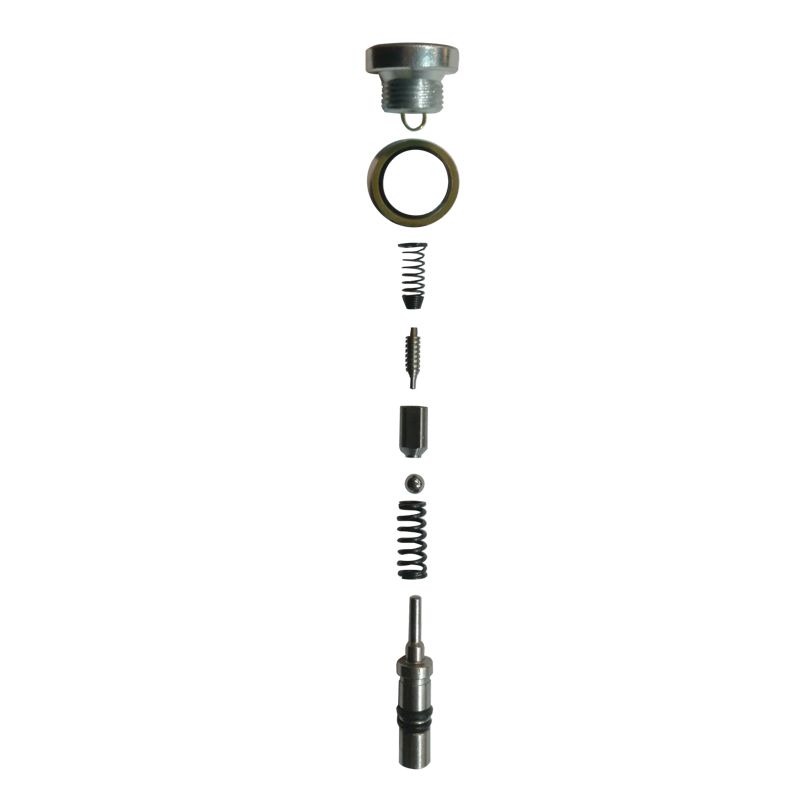 Клапан в сборе для гидравлических тележек DF25. 8 деталей: пробка клапана – длина 18 мм, диаметр 28 мм; шайба диаметром 30 мм; конусная пружина – диаметр наименьший 7 мм, длина 22 мм; шток седла клапана – диаметр 5 мм, длина 19 мм; седло клапана – диаметр 9 мм, длина 16 мм; металлический шарик диаметром 6 мм; пружина – длина 25 мм, диаметр 9 мм; шток клапана – длина 47 мм, диаметр 10 мм.