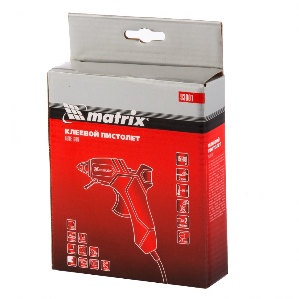 Клеевой пистолет Matrix 93001 мощностью 15 (40) Вт, производительностью 5 г/мин, работает со стержнями диаметром 7 мм. Используется для бытовых и полупрофессиональных нужд: мелкого ремонта, упаковки товаров, фиксации деталей, изготовления игрушек и объемных украшений, декорирования и т.д. Инструмент пригодится моделистам, мастерам отделки и хенд-мейда.