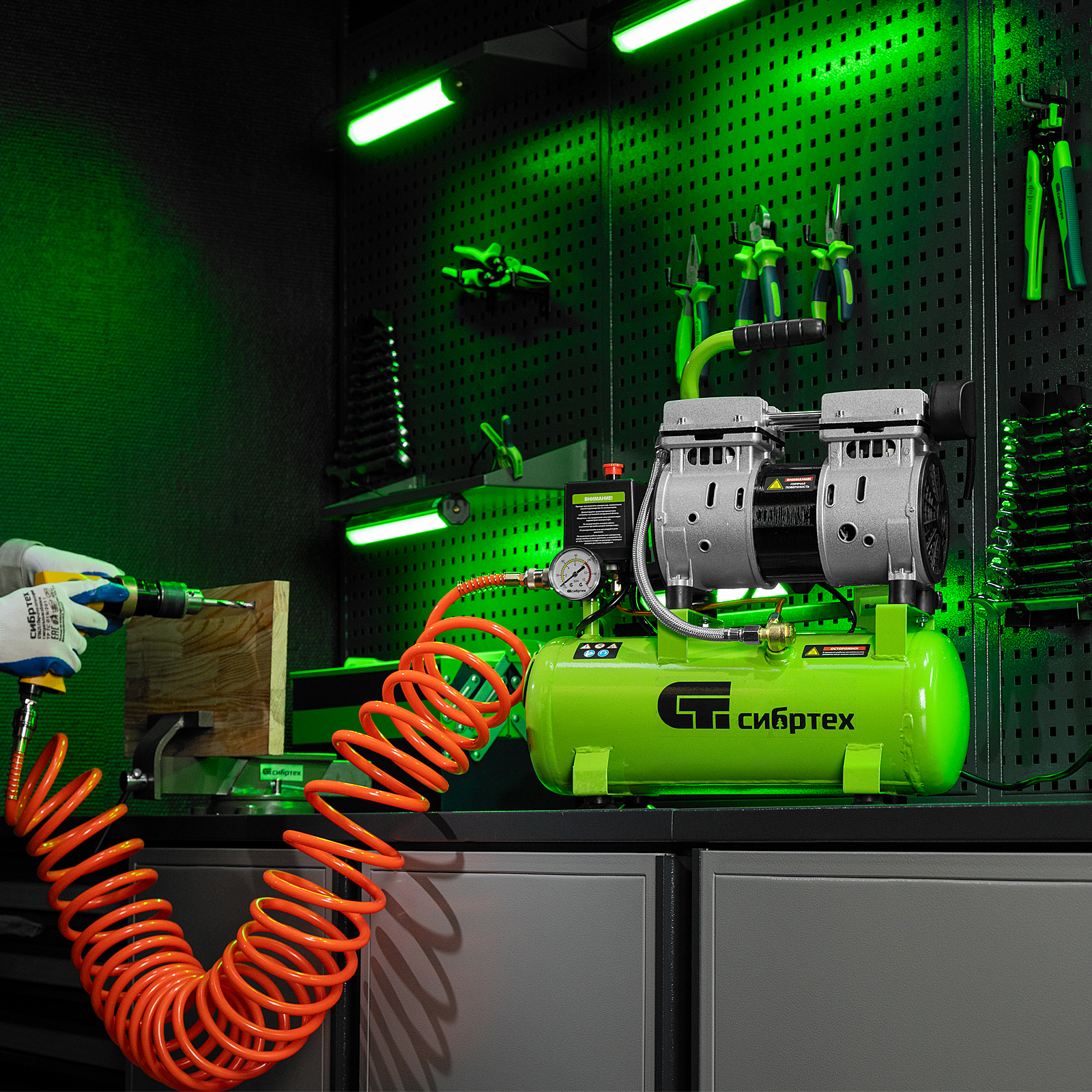 - Простое подключение — выходной быстросъемный коннектор позволяет подсоединить пневмоинструмент одним движением.