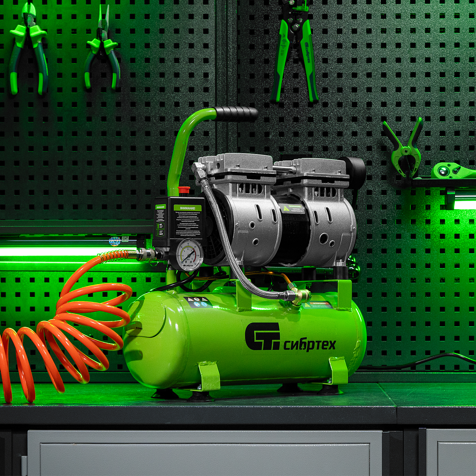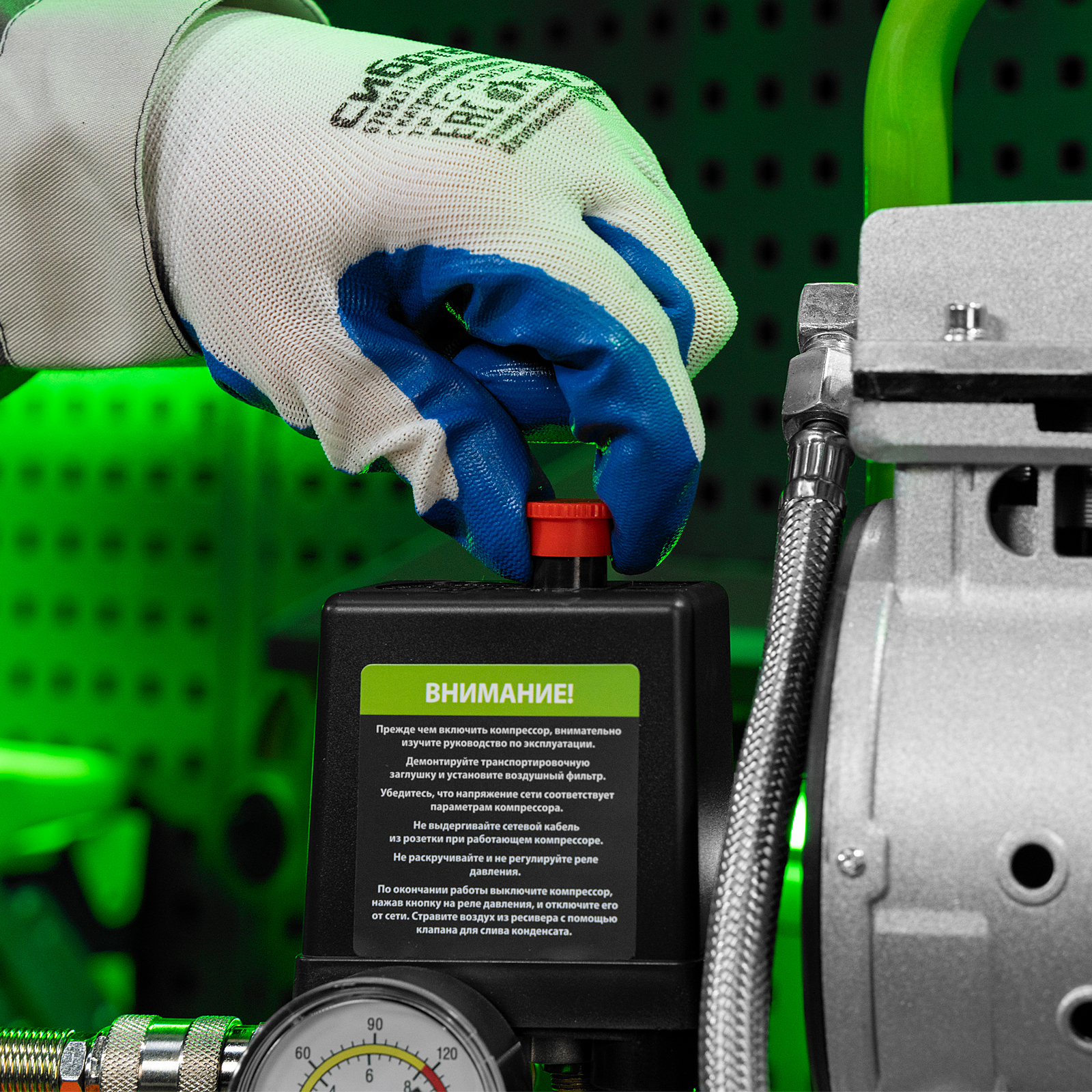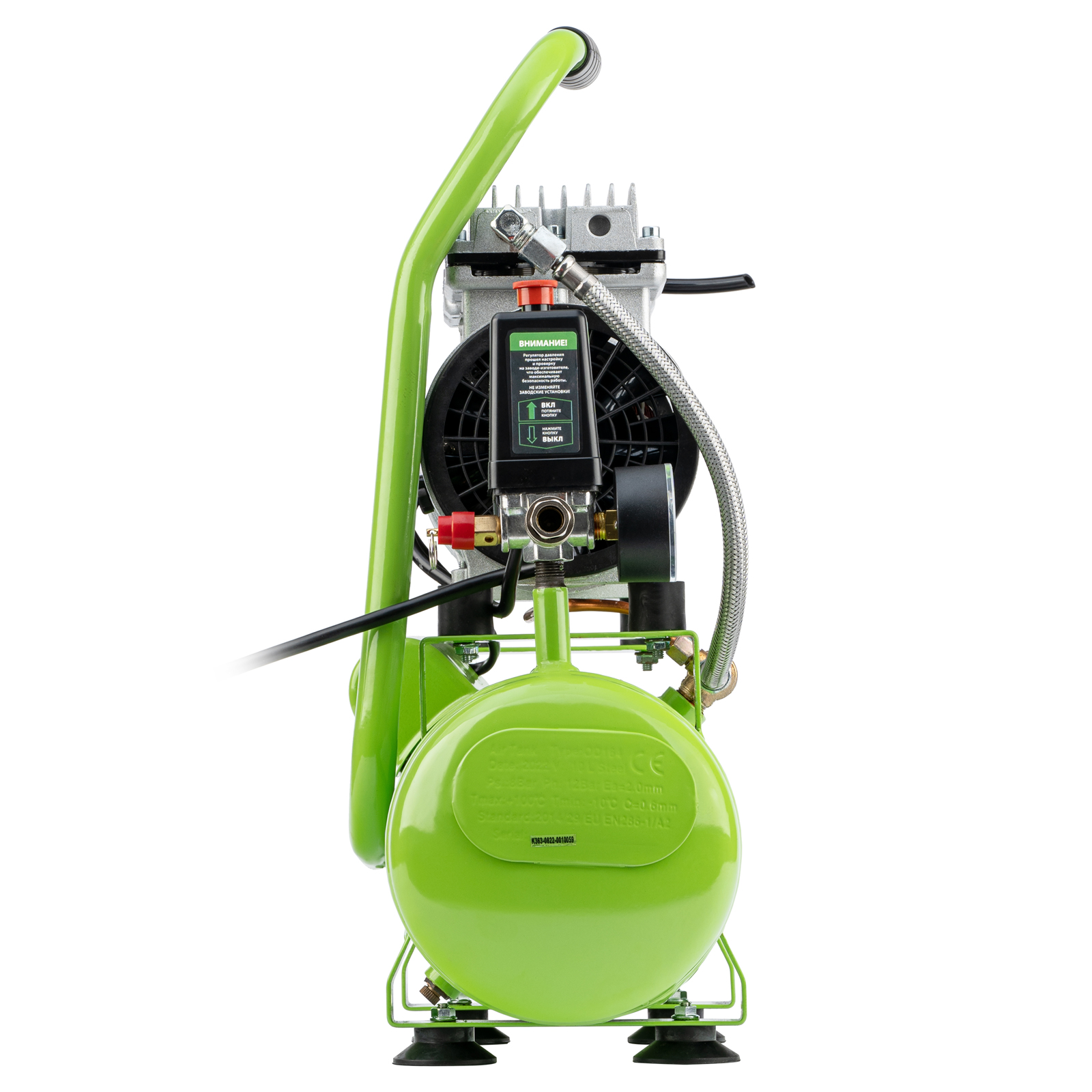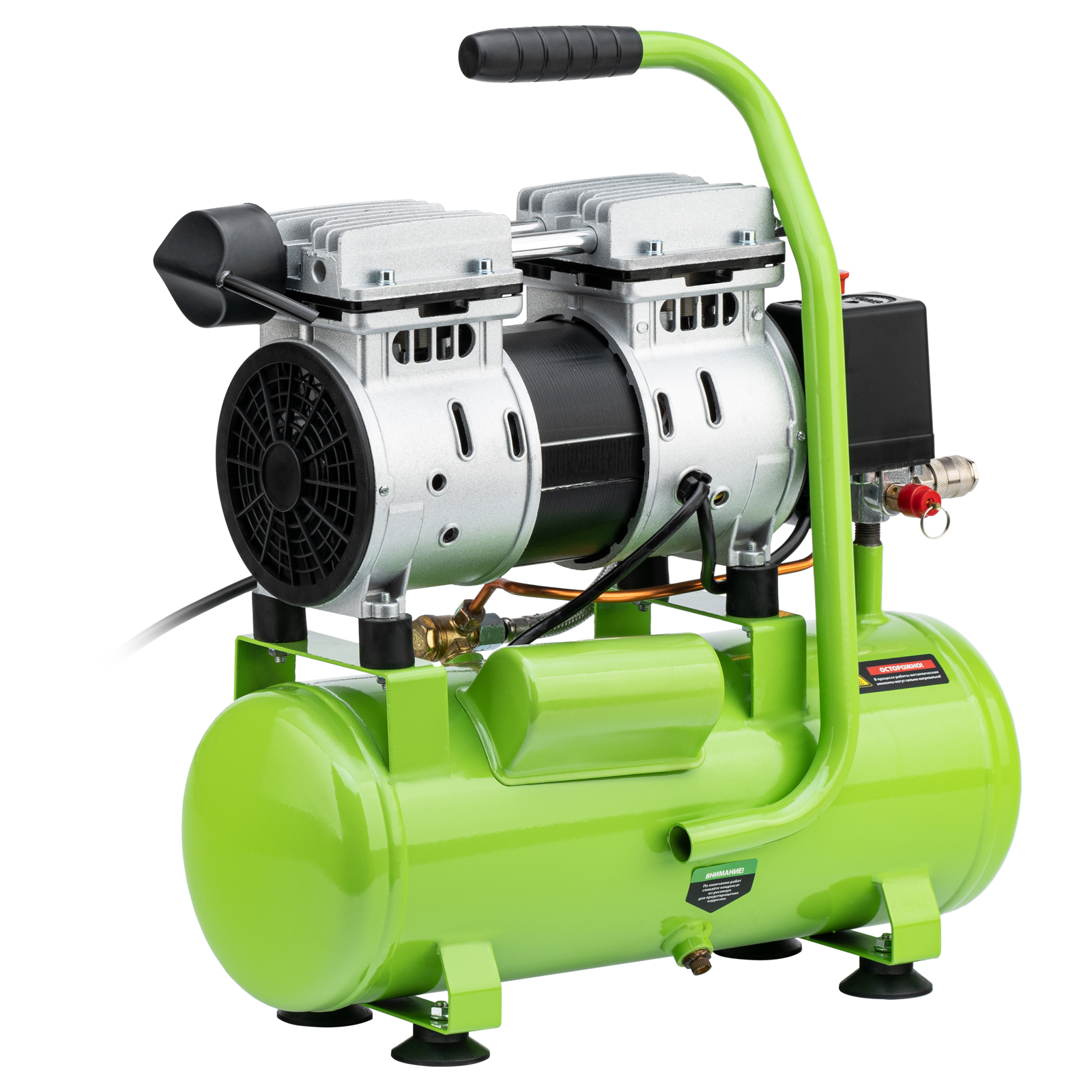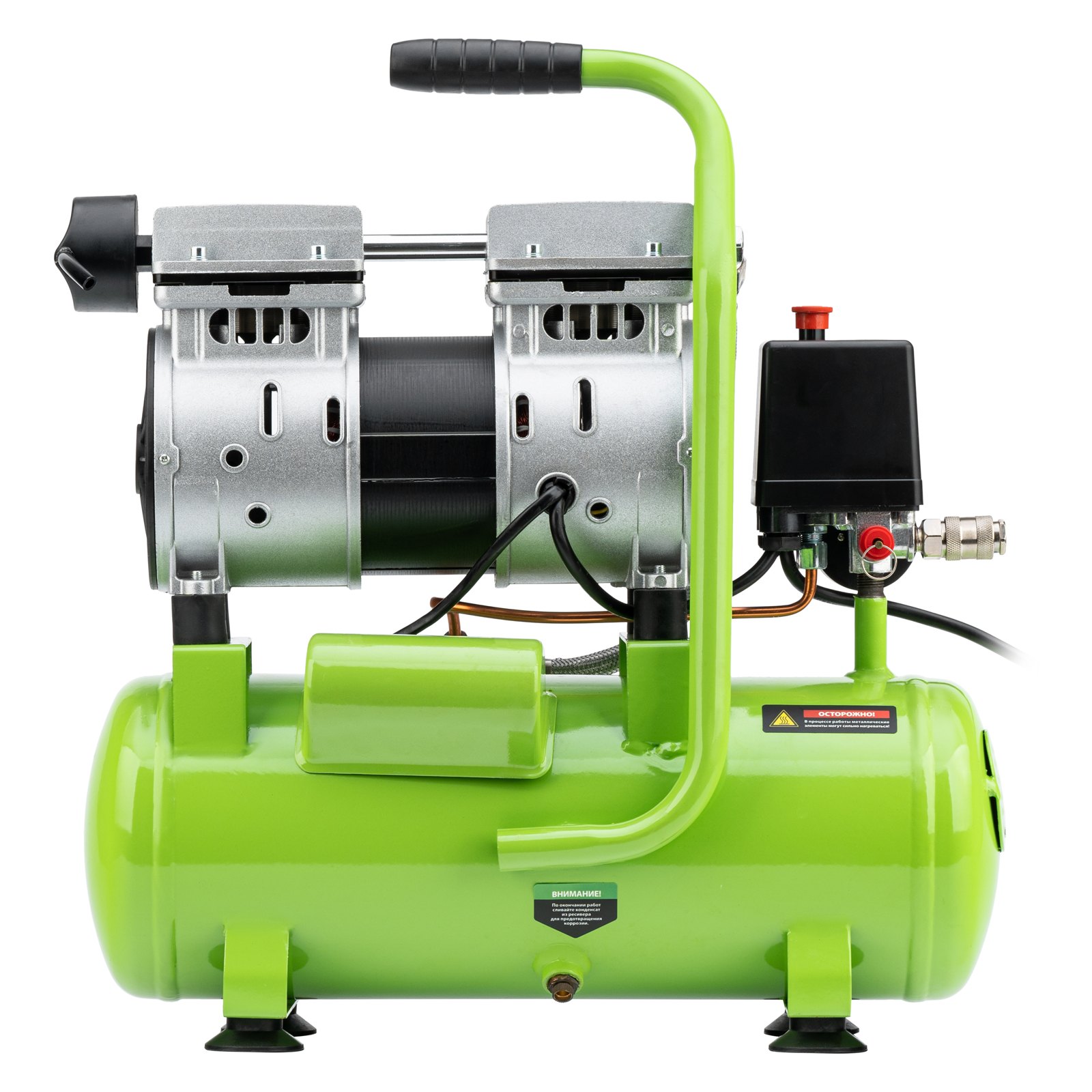 - Контроль рабочих параметров — компрессор оборудован механическим манометром для отслеживания давления.