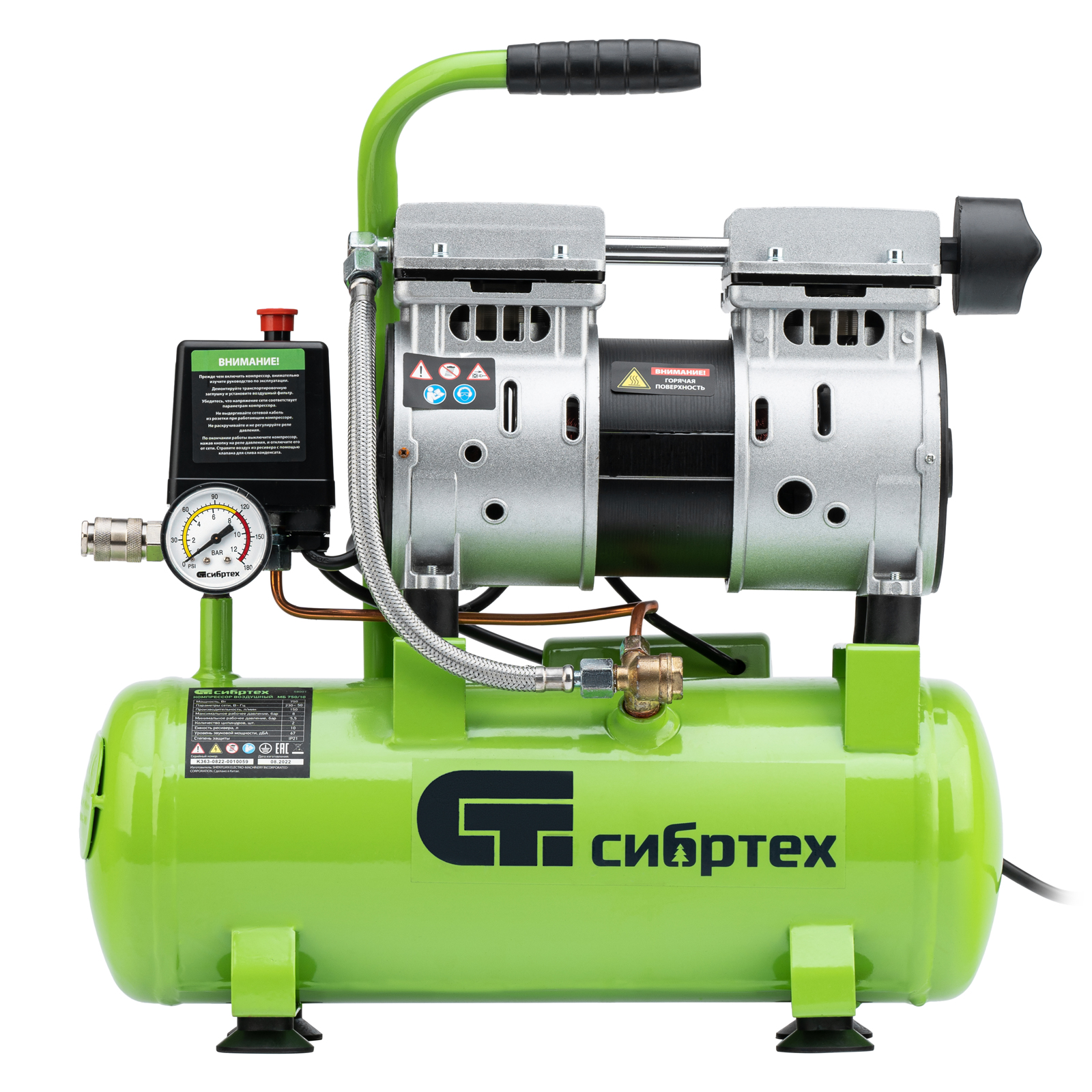Компрессор безмаслянный малошумный МБ 750/10,750 Вт, 10 л, 150 л/мин Сибртех в Москве
