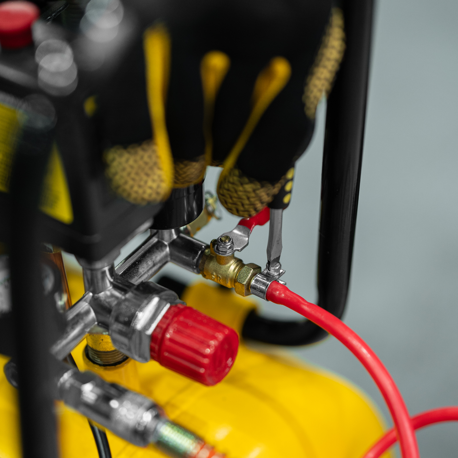- Регулятор выходного давления — в зависимости от типа пневматического инструмента мастер может точно настроить необходимый уровень давления, чтобы добиться идеального результата.