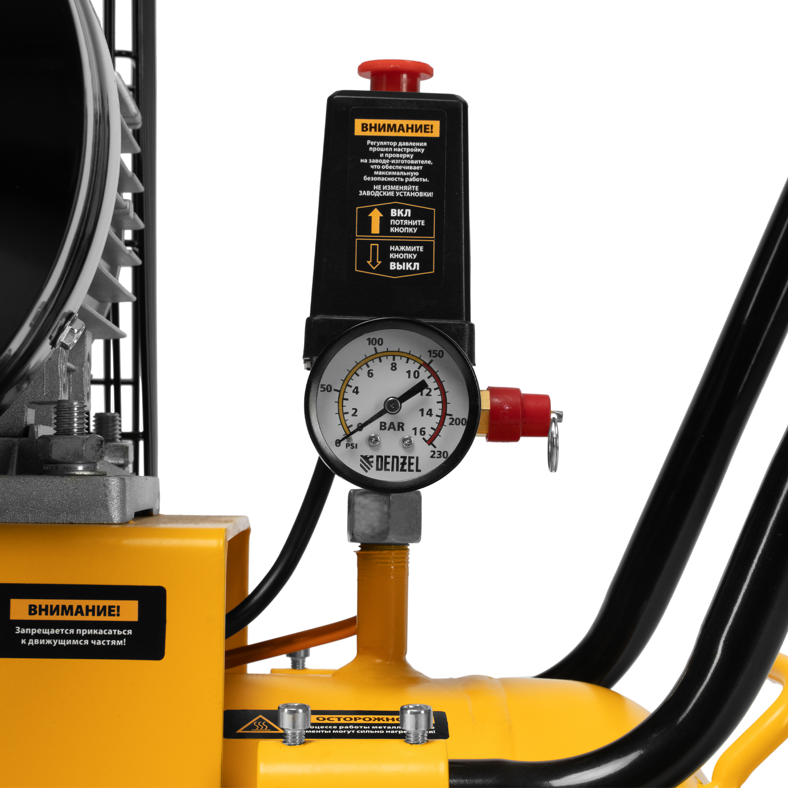 - Безопасность — в случае превышения максимально допустимого давления в ресивере срабатывает предохранительный клапан.