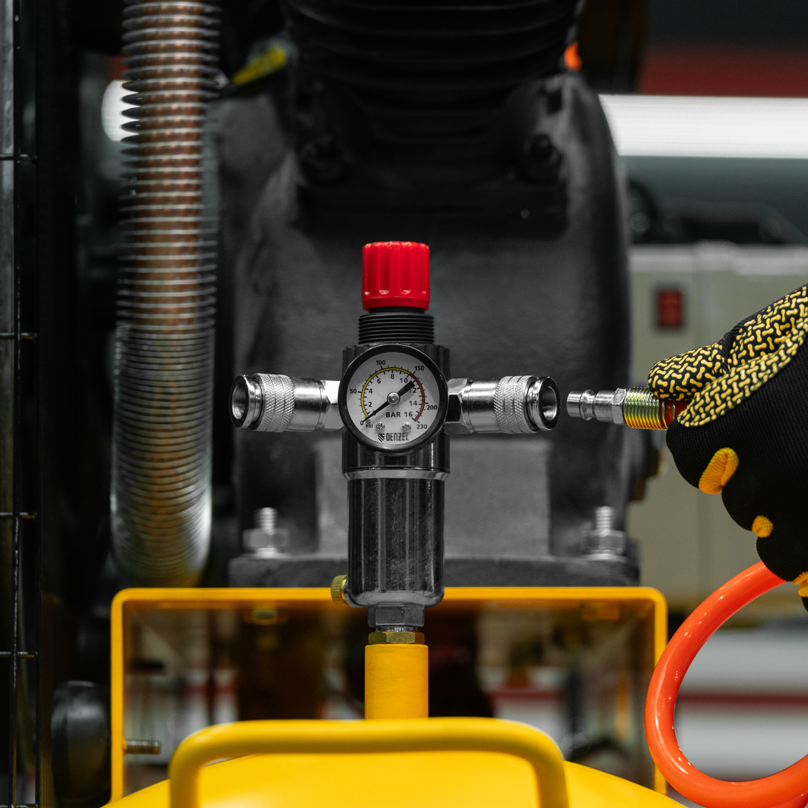 - Регулировка давления на выходе — можно установить оптимальное значение для подключения пневмоинструмента.