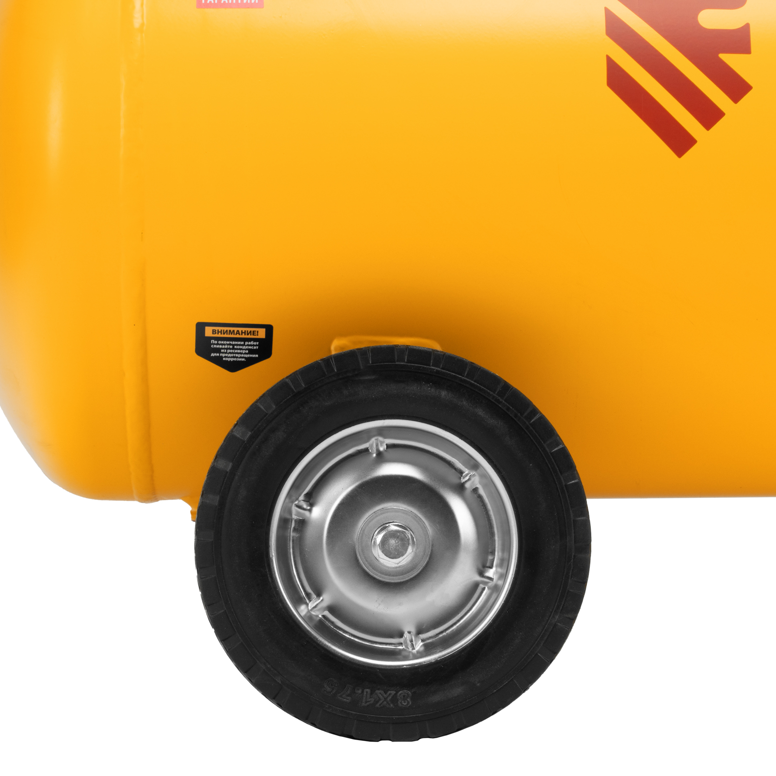 - Удобная транспортировка — на компрессоре установлены колеса, в т. ч. поворотные, и П-образная рукоятка.