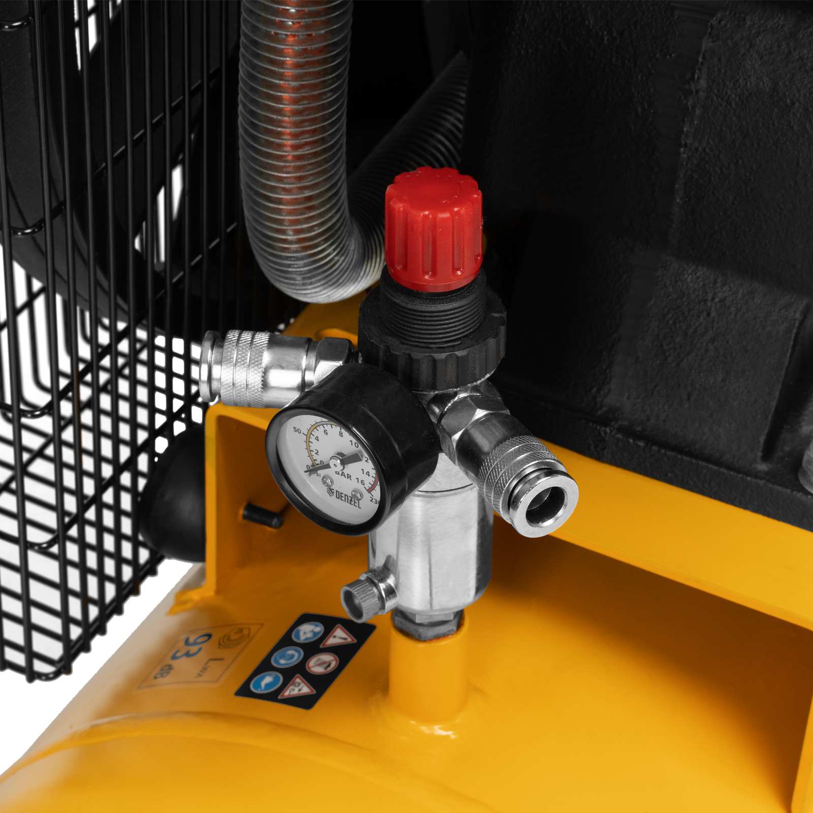 Воздушный компрессор Denzel BCV 4000-T/100 58117 с ременным приводом, мощностью 4,0 кВт и производительностью 690 л/мин, с ресивером объемом 100 л, — источник сжатого воздуха для работы с пневмогайковертом, пневмодрелью, краскопультом, углошлифовальной машиной или другим пневмоинструментом. Двигатель с медной обмоткой обеспечивает стабильную работу в течение длительного времени. Для подключения инструмента предусмотрено 2 быстросъемных коннектора Рапид (Евро) и штуцер «елочка» с краном. Специальный порт позволяет подключить напрямую дополнительный ресивер или пневмомагистраль. Компрессор отличается высокой производительностью и будет полезен на строительной площадке и станции техобслуживания.