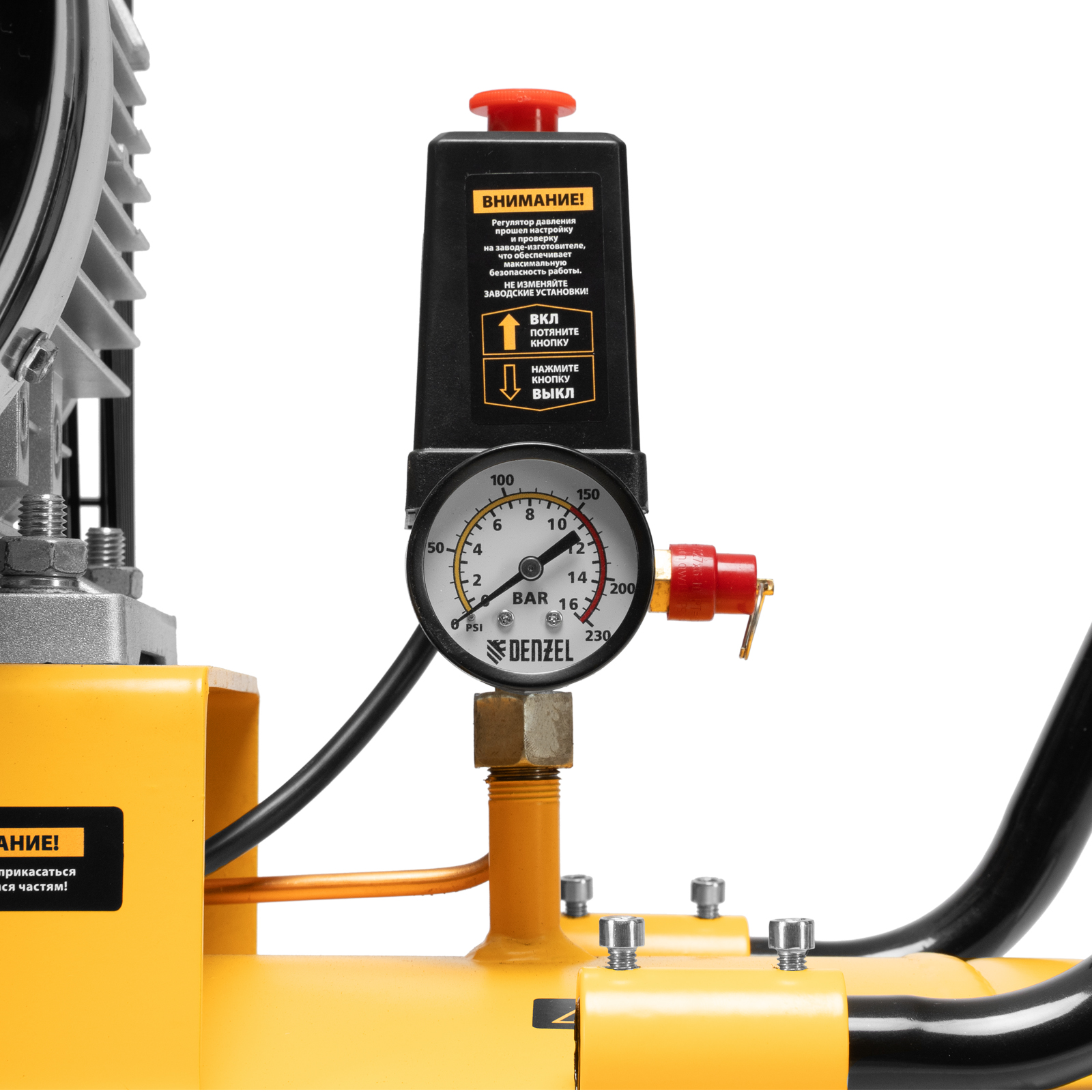 - Безопасность — в случае превышения максимально допустимого давления в ресивере срабатывает предохранительный клапан.
