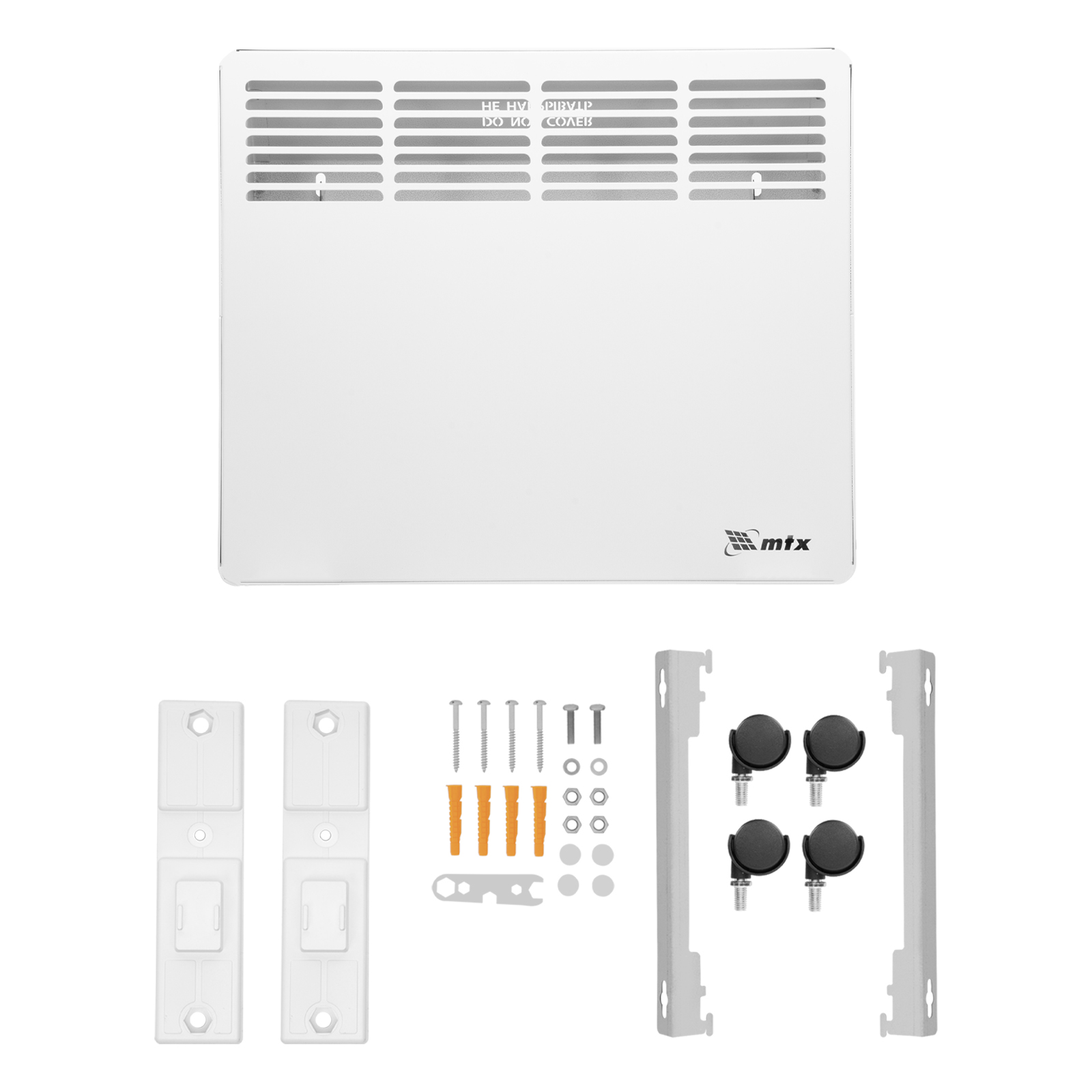 - Два варианта монтажа — конвектор можно расположить на полу или повесить на стену (колесные пары и кронштейн входят в комплект поставки).