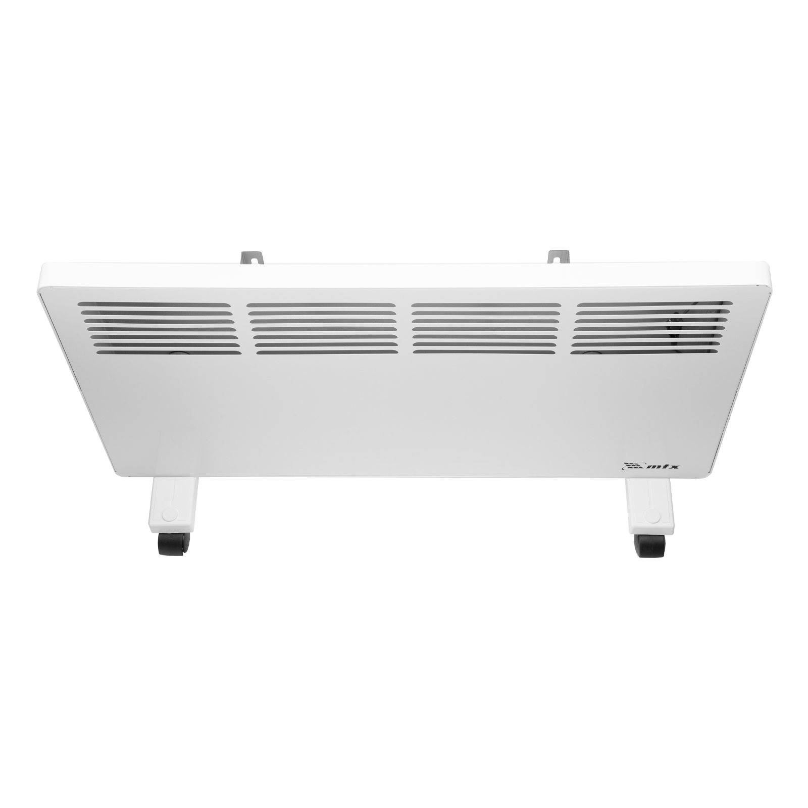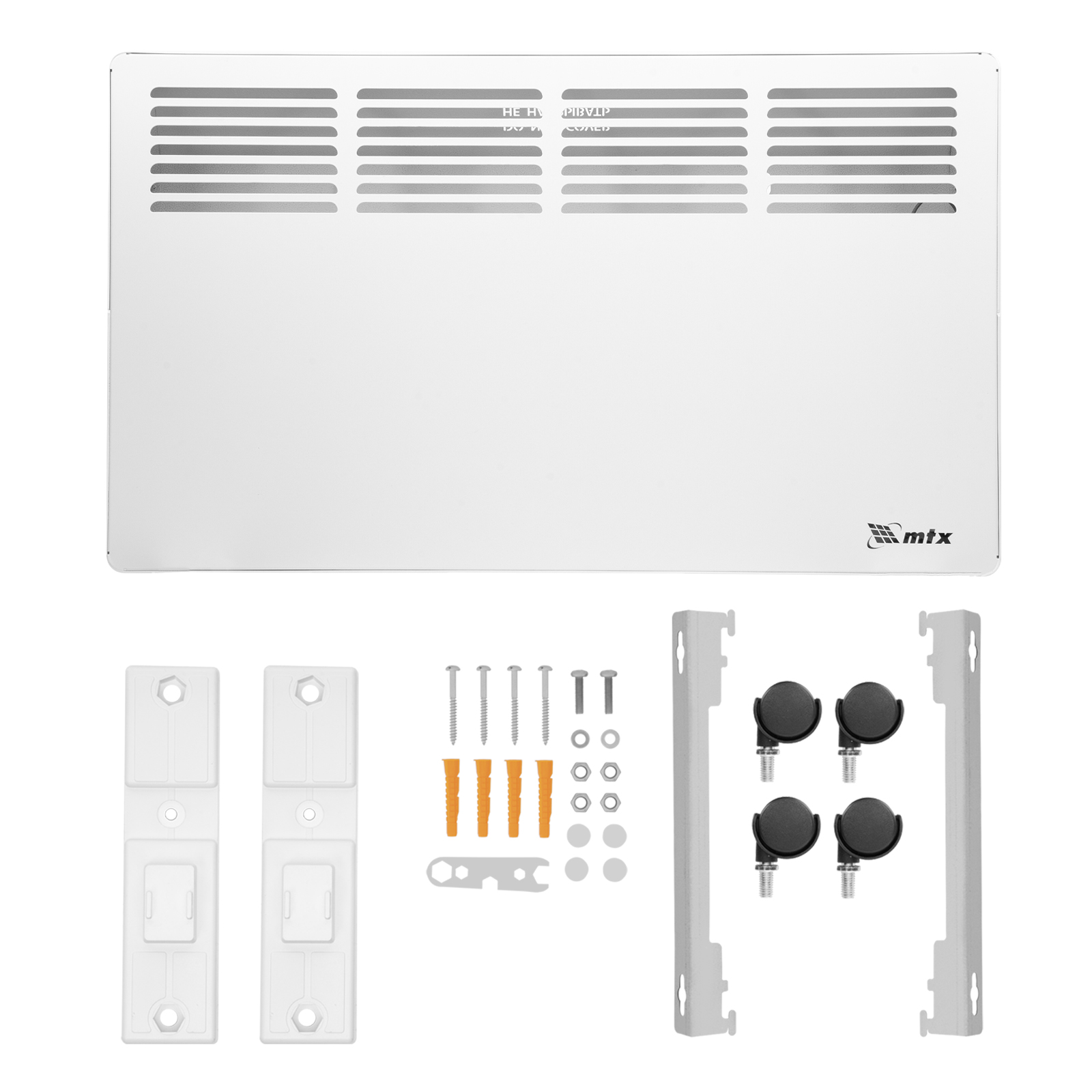 - Два варианта монтажа — конвектор можно расположить на полу или повесить на стену (колесные пары и кронштейн входят в комплект поставки).