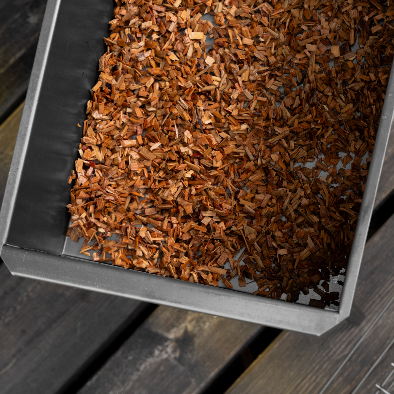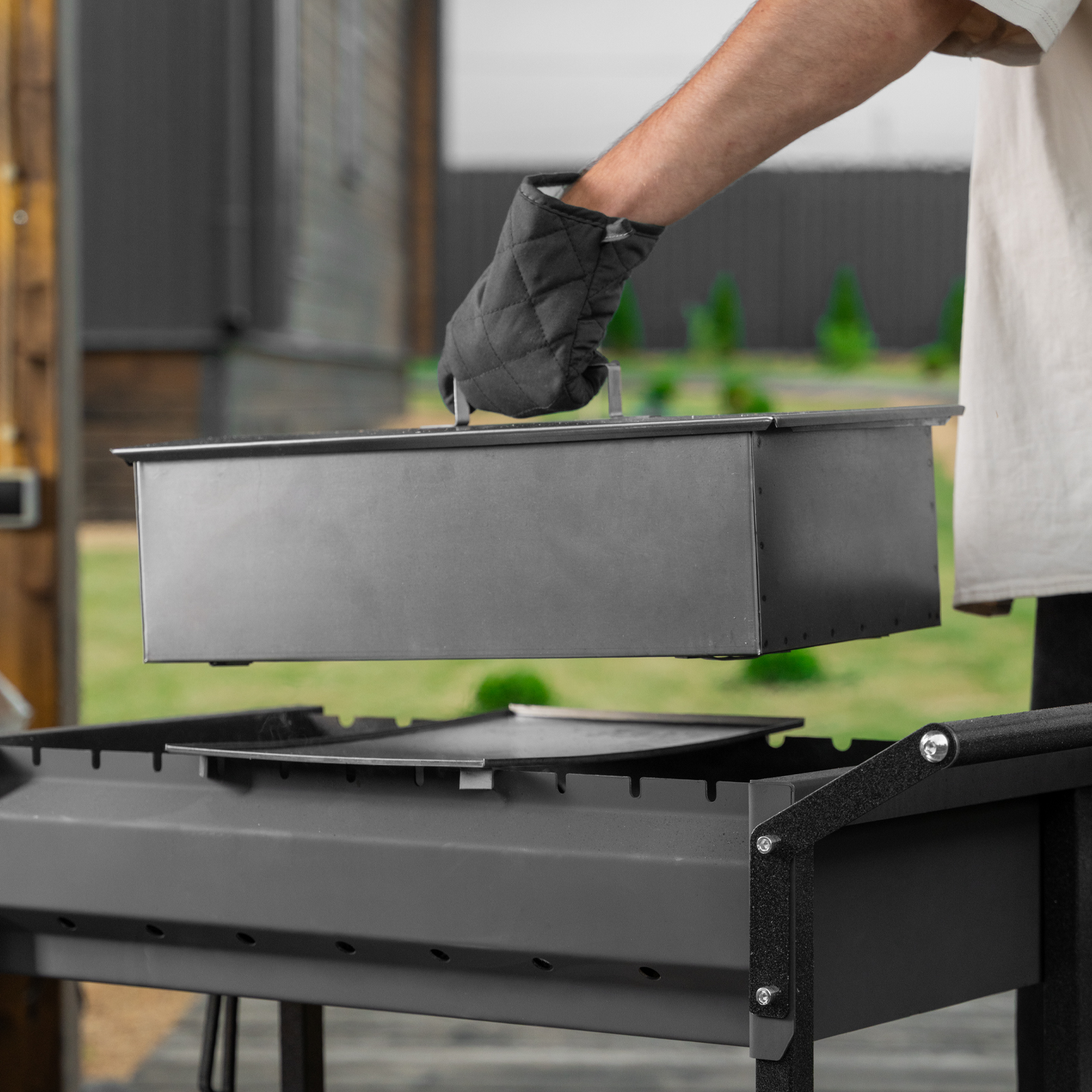 - Высокие вкусовые качества приготовленной пищи — поддон препятствует попаданию жира на щепу, что исключает возникновение неприятного запаха и искажение вкуса еды.