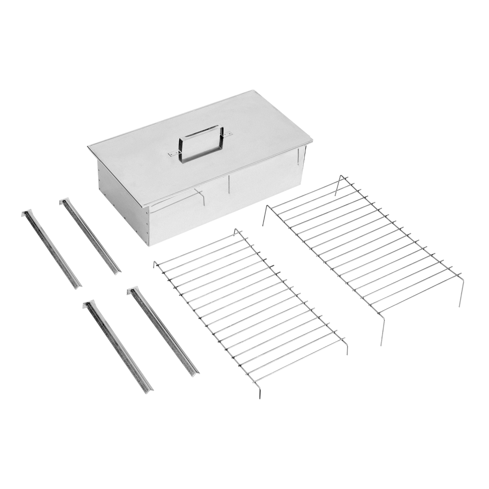 Корпус коптильни - 1 штКрышка - 1 штРешетка - 2 штНожки - 4 штПоддон - 1 штКрышка - 1 штПоддон для сбора жира - 1 штРешетка - 1 шт |