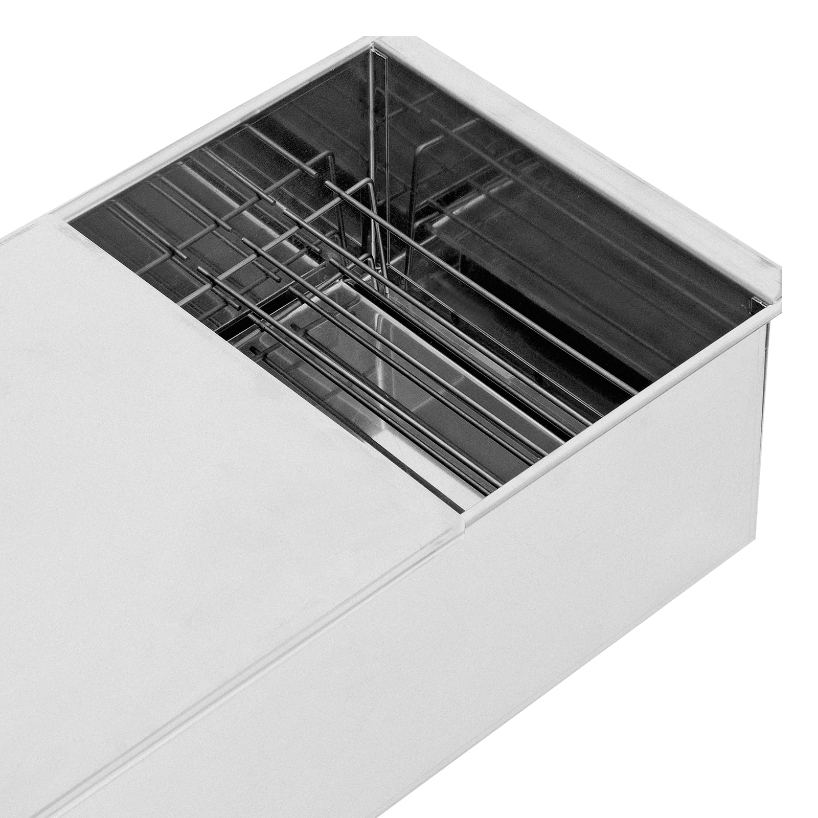 - Высокое качество приготовленной пищи — крышка-слайдер способствует сохранению оптимальной температуры и ароматного дыма внутри коптильни, а поддон предотвращает попадание жира на горючее и стенки.