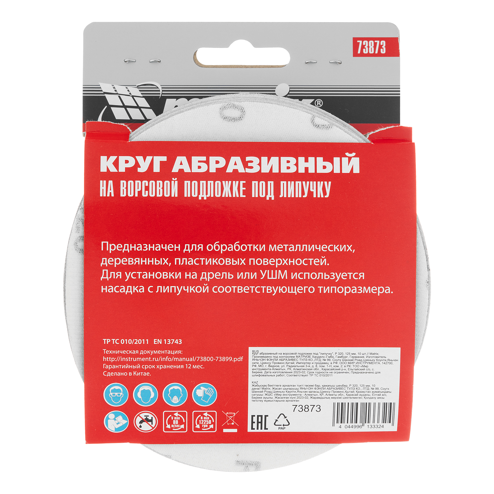 Круг абразивный на ворсовой подложке под "липучку", P 320, 125 мм, 10 шт Matrix