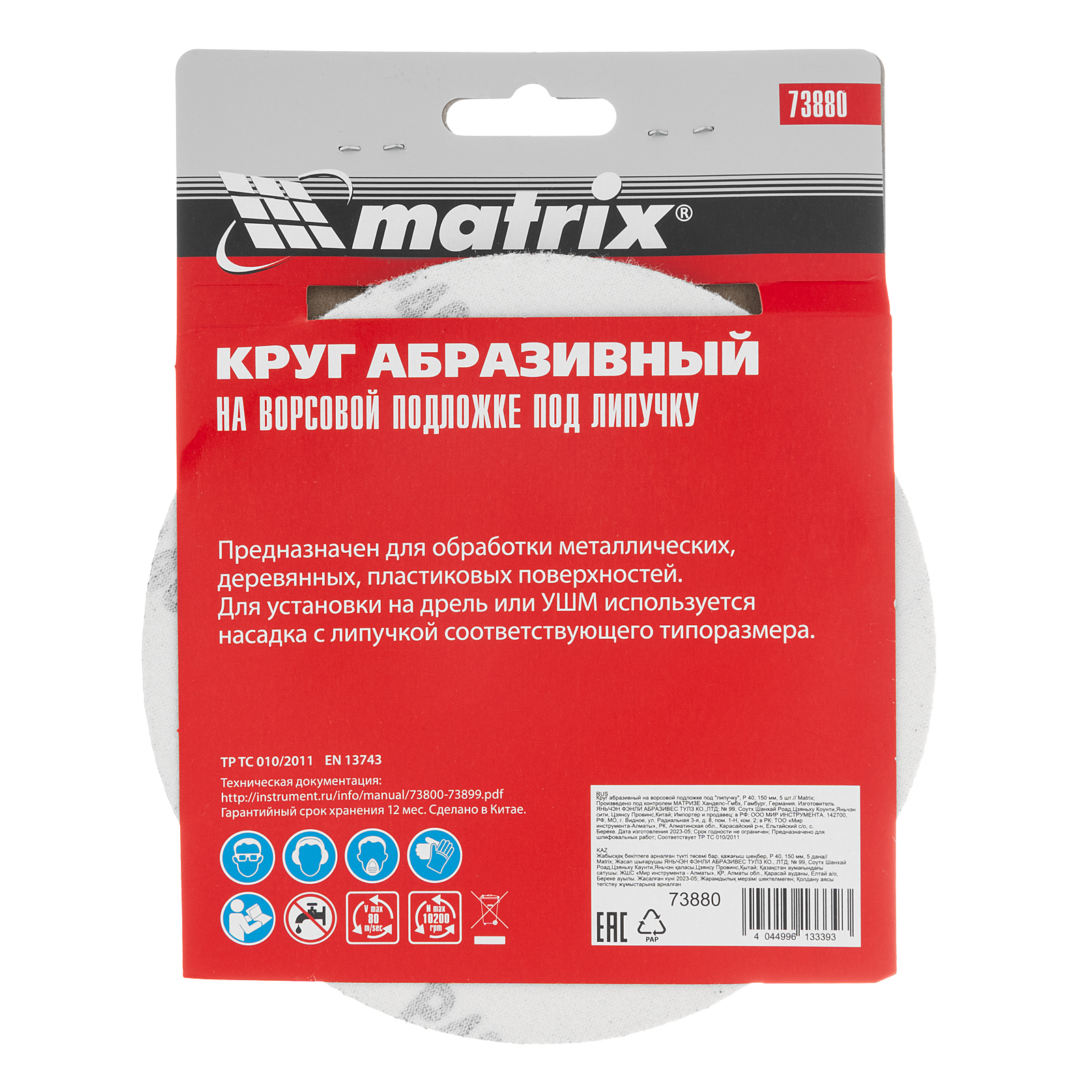 Абразивный круг на ворсовой подложке под «липучку» Matrix Р40 арт. 73880 используется для сухого чернового шлифования металла, дерева, пластика и других поверхностей. Круг устанавливается на эксцентриковые (орбитальные) шлифовальные машинки или на дрель с помощью опорной насадки Matrix.