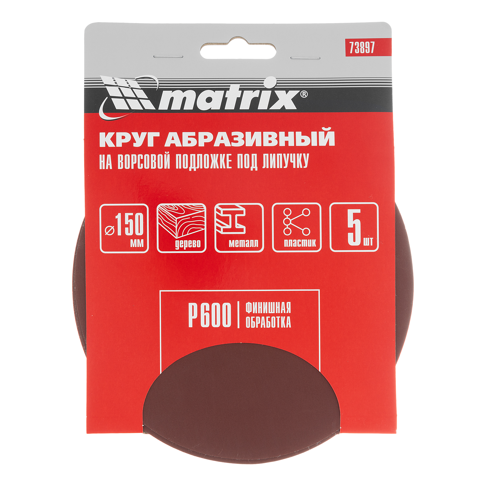Круг абразивный на ворсовой подложке под "липучку", P 600, 150 мм, 5 шт Matrix