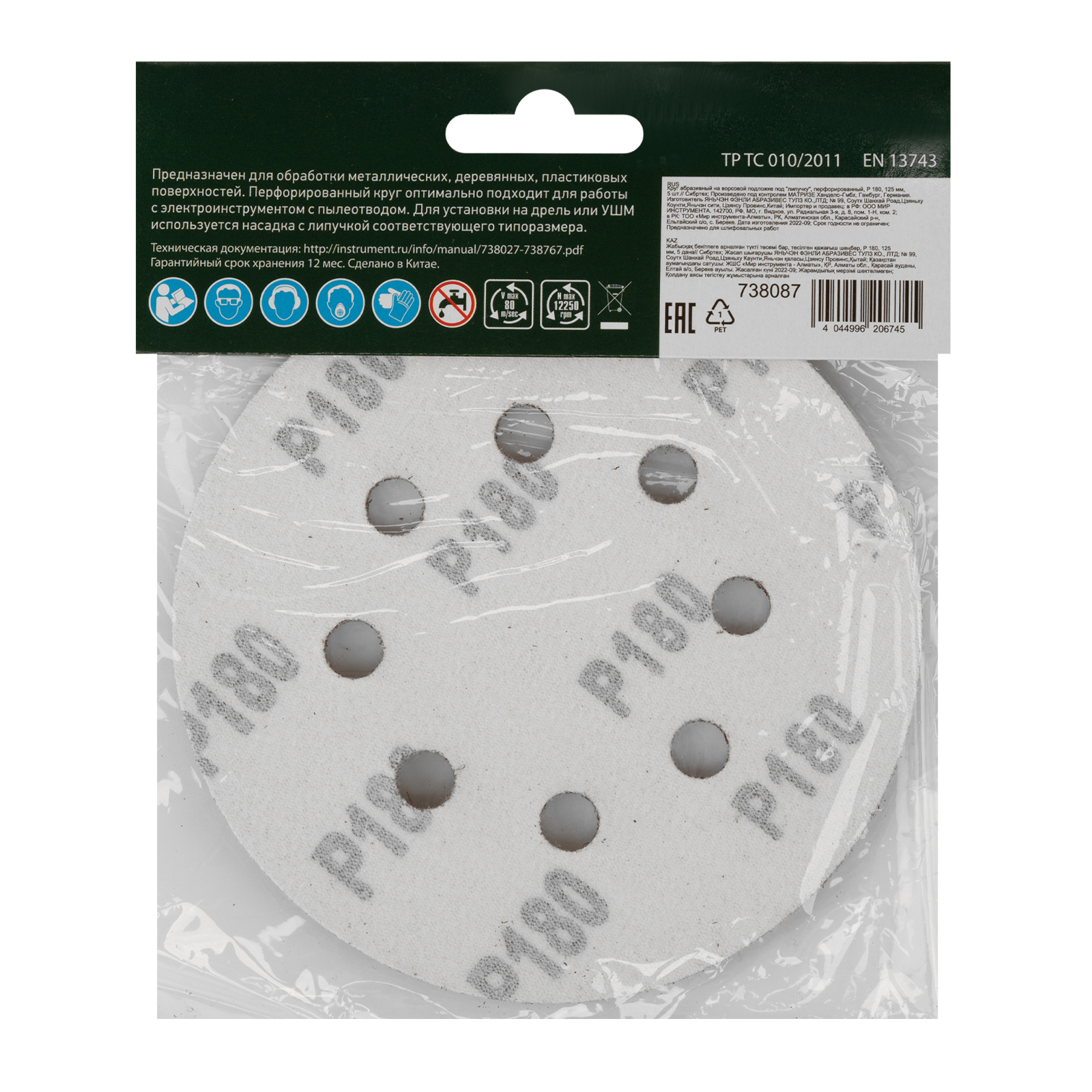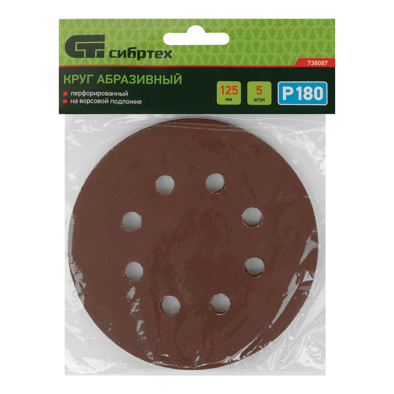 Круг абразивный на ворсовой подложке под "липучку", перфорированный, P 180, 125 мм, 5 шт Сибртех