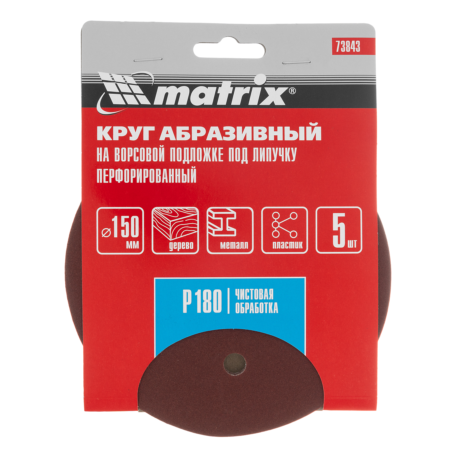 Круг абразивный на ворсовой подложке под "липучку", перфорированный, P 180, 150 мм, 5 шт Matrix