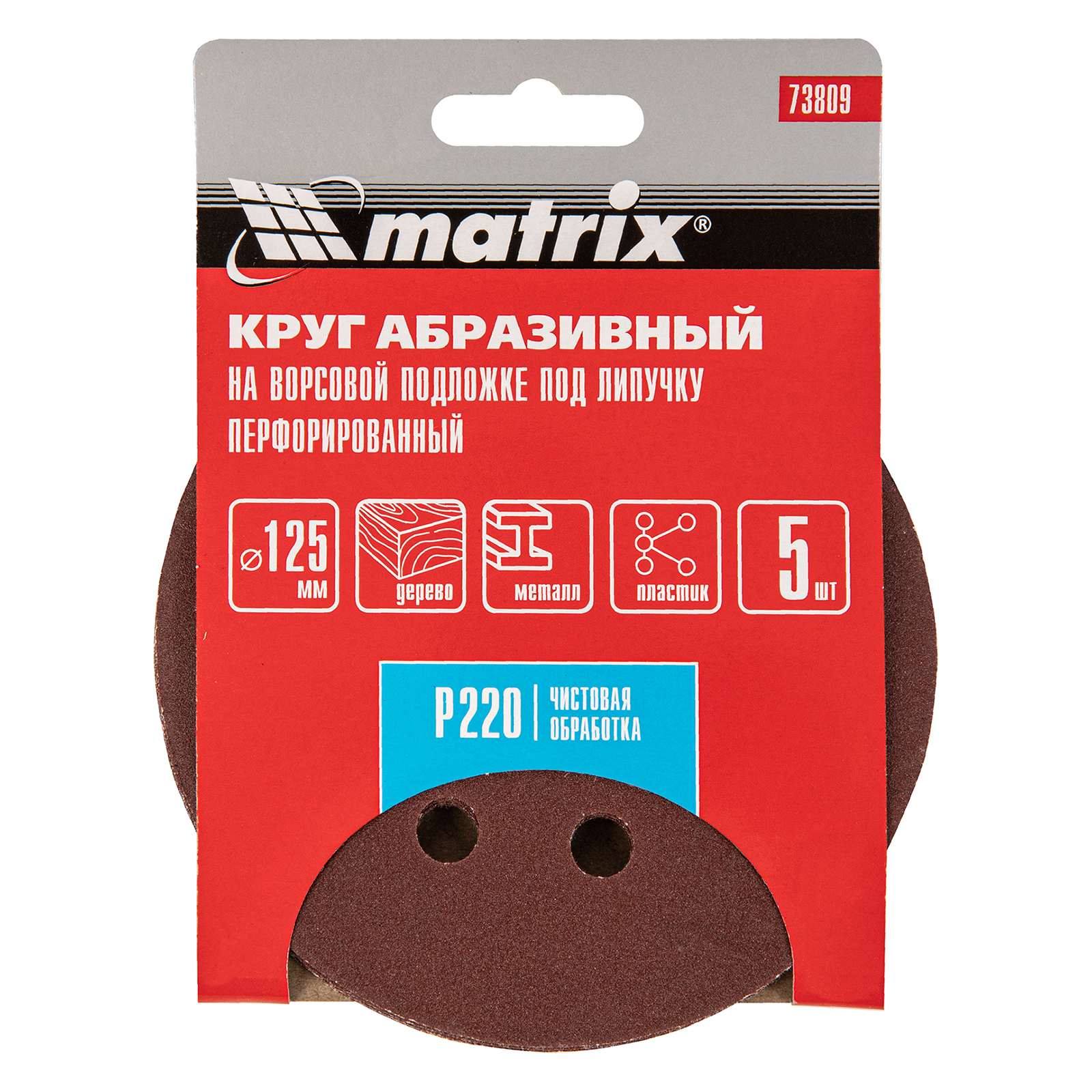 Перфорированный абразивный круг Matrix 73809 диаметром 125 мм, с мелкозернистым абразивом P 220, на ворсовой подложке под «липучку», 5 шт. в упаковке, используется для сухого финишного шлифования металла, древесины, пластика и других материалов. Позволяет получить гладкую поверхность, подготовить ее к покраске. Круг устанавливается на эксцентриковую (орбитальную) шлифовальную машинку с отводом воздуха или на дрель с помощью опорной насадки Matrix.