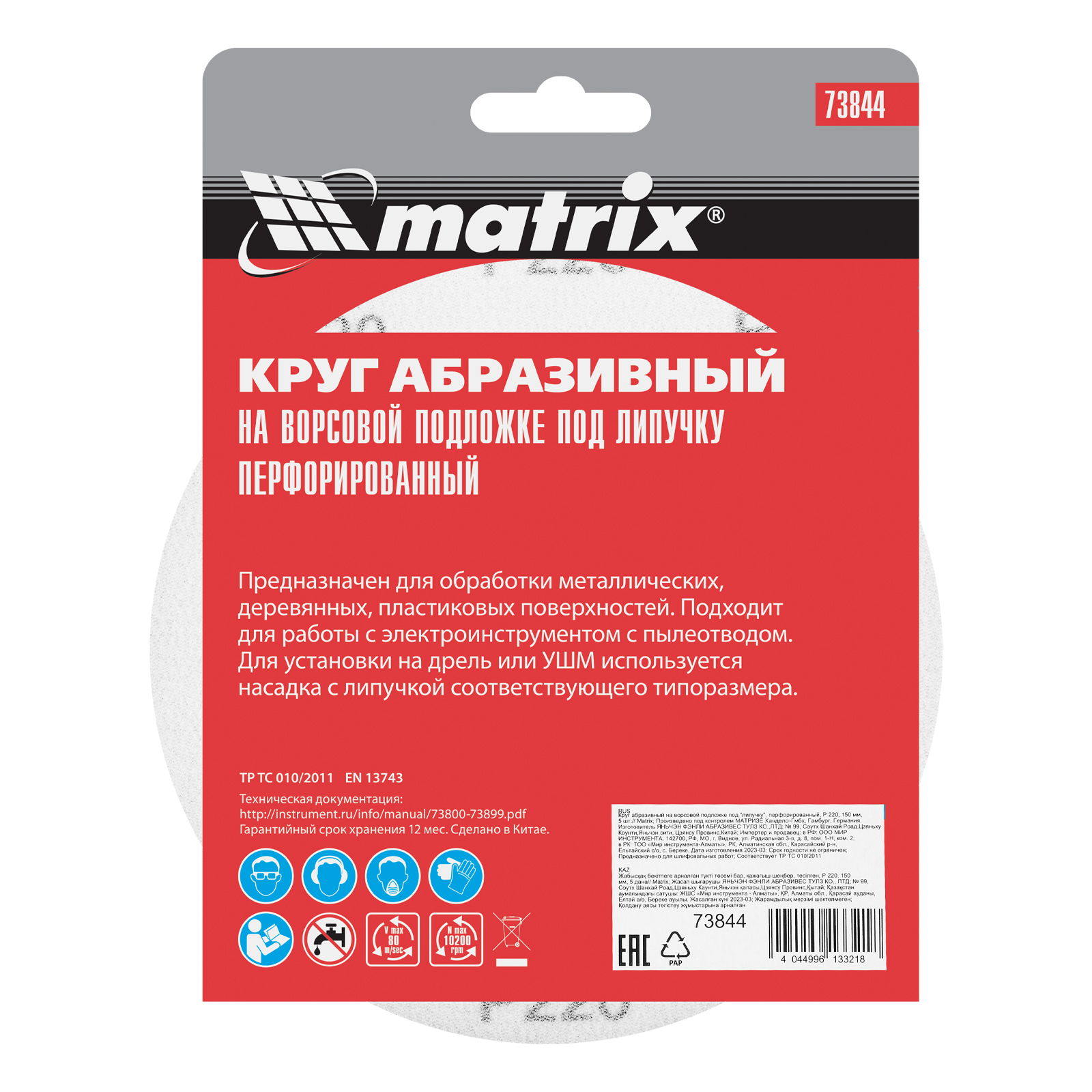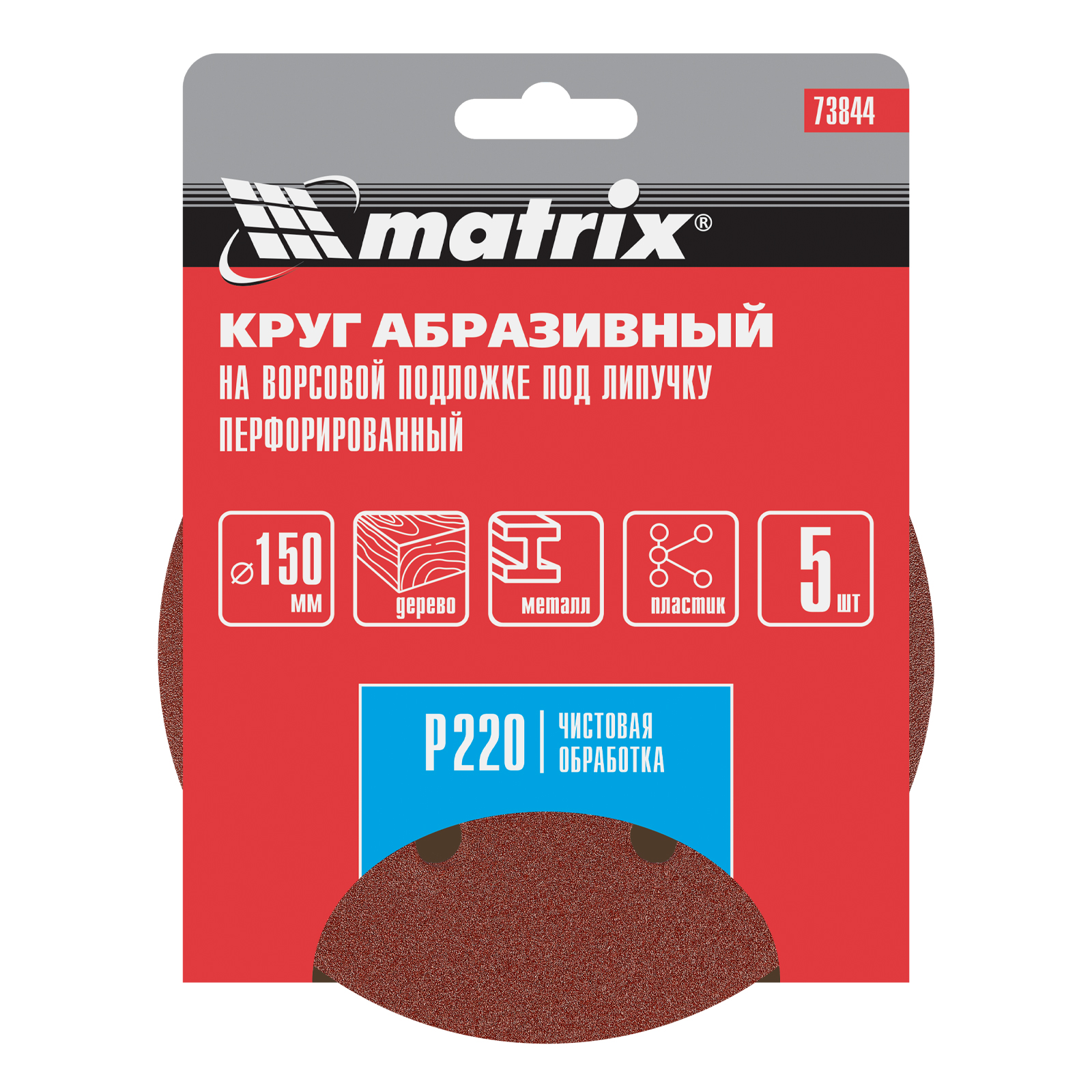 Круг абразивный на ворсовой подложке под "липучку", перфорированный, P 220, 150 мм, 5 шт Matrix