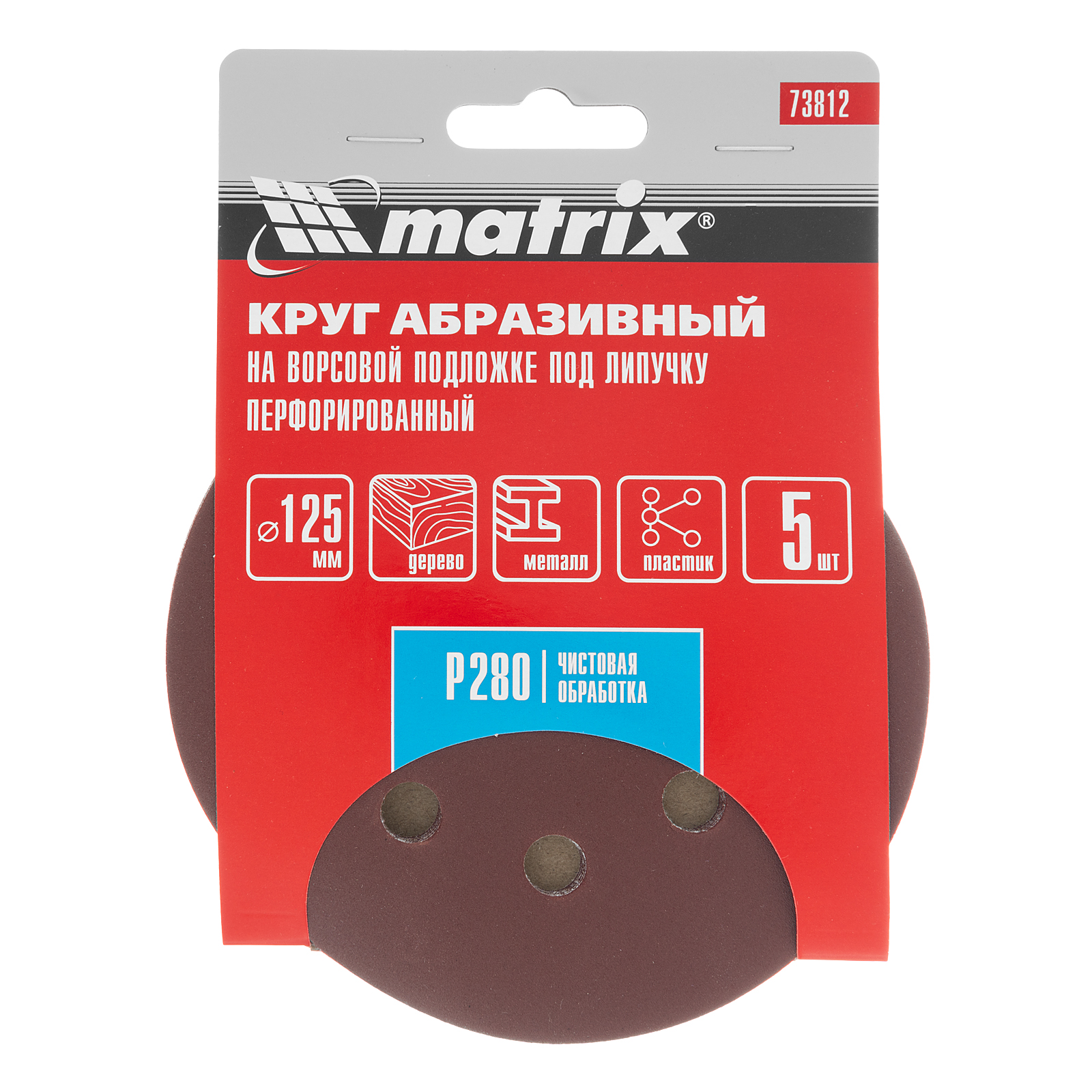Перфорированный абразивный круг Matrix 73812 диаметром 125 мм, с мелкозернистым абразивом P 280, на ворсовой подложке под «липучку», 5 шт. в упаковке, используется для сухого финишного шлифования металла, древесины, пластика и других материалов. Позволяет придать поверхности гладкость для нанесения краски, лака и других покрытий. Круг устанавливается на эксцентриковую (орбитальную) шлифовальную машинку с отводом воздуха или на дрель с помощью опорной насадки Matrix.