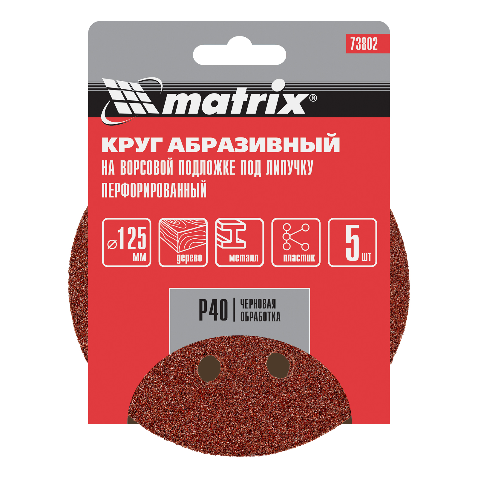 Перфорированный абразивный круг Matrix 73802 диаметром 125 мм, с крупнозернистым абразивом P 40, на ворсовой подложке под «липучку», 5 шт. в упаковке, используется для сухого чернового шлифования металла, древесины, пластика и других поверхностей. Позволяет избавиться от заусенцев, подходит для зачистки старого покрытия (краски/лака), удаления ржавчины, снятия слоя материала. Круг устанавливается на эксцентриковую (орбитальную) шлифовальную машинку с отводом воздуха или на дрель с помощью опорной насадки Matrix.