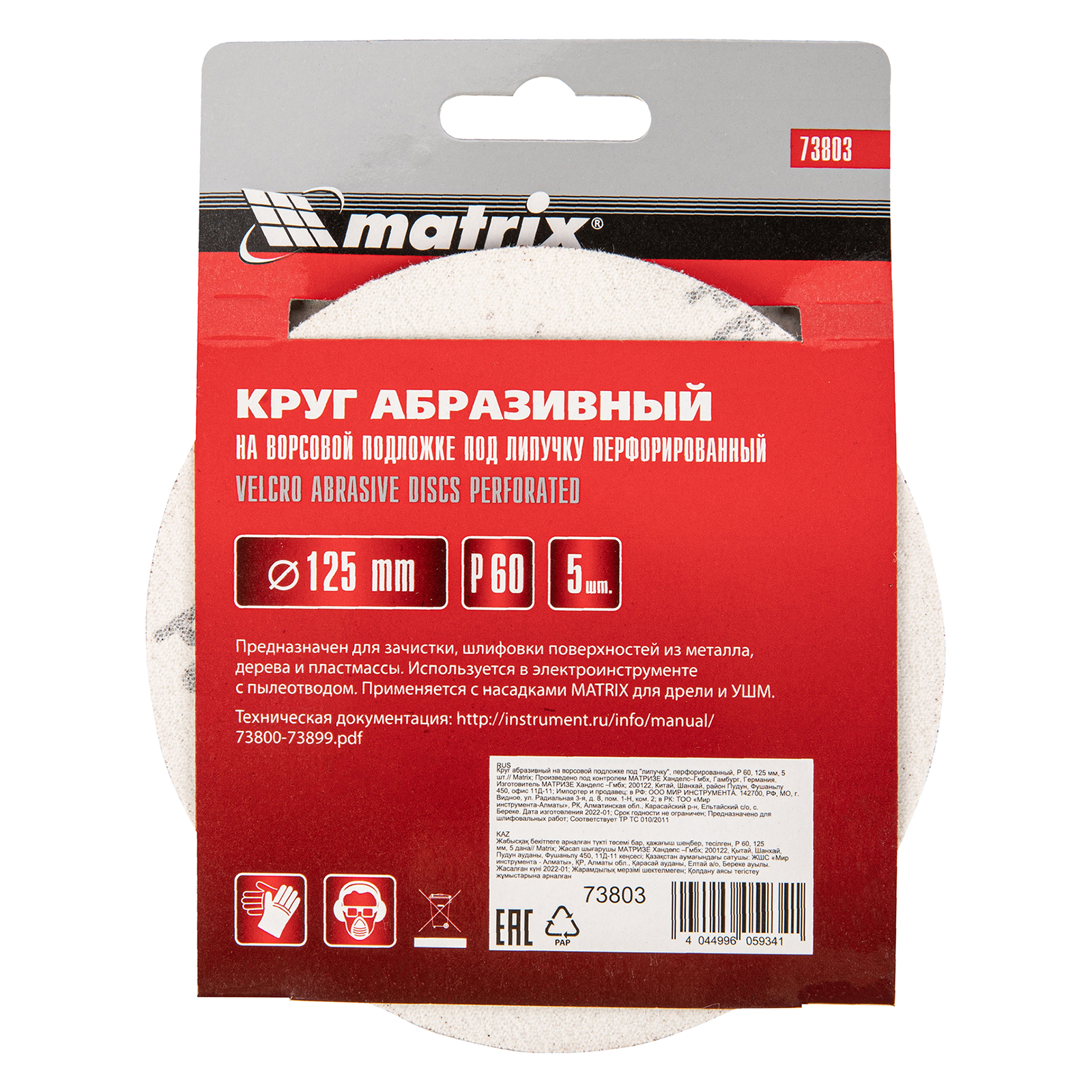 Перфорированный абразивный круг Matrix 73803 диаметром 125 мм, с крупнозернистым абразивом P 60, на ворсовой подложке под «липучку», 5 шт. в упаковке, используется для сухого чернового шлифования металла, древесины, пластика и других поверхностей. Позволяет избавиться от заусенцев, подходит для зачистки старого покрытия (краски/лака), удаления ржавчины, снятия слоя материала. Круг устанавливается на эксцентриковую (орбитальную) шлифовальную машинку с отводом воздуха или на дрель с помощью опорной насадки Matrix.
