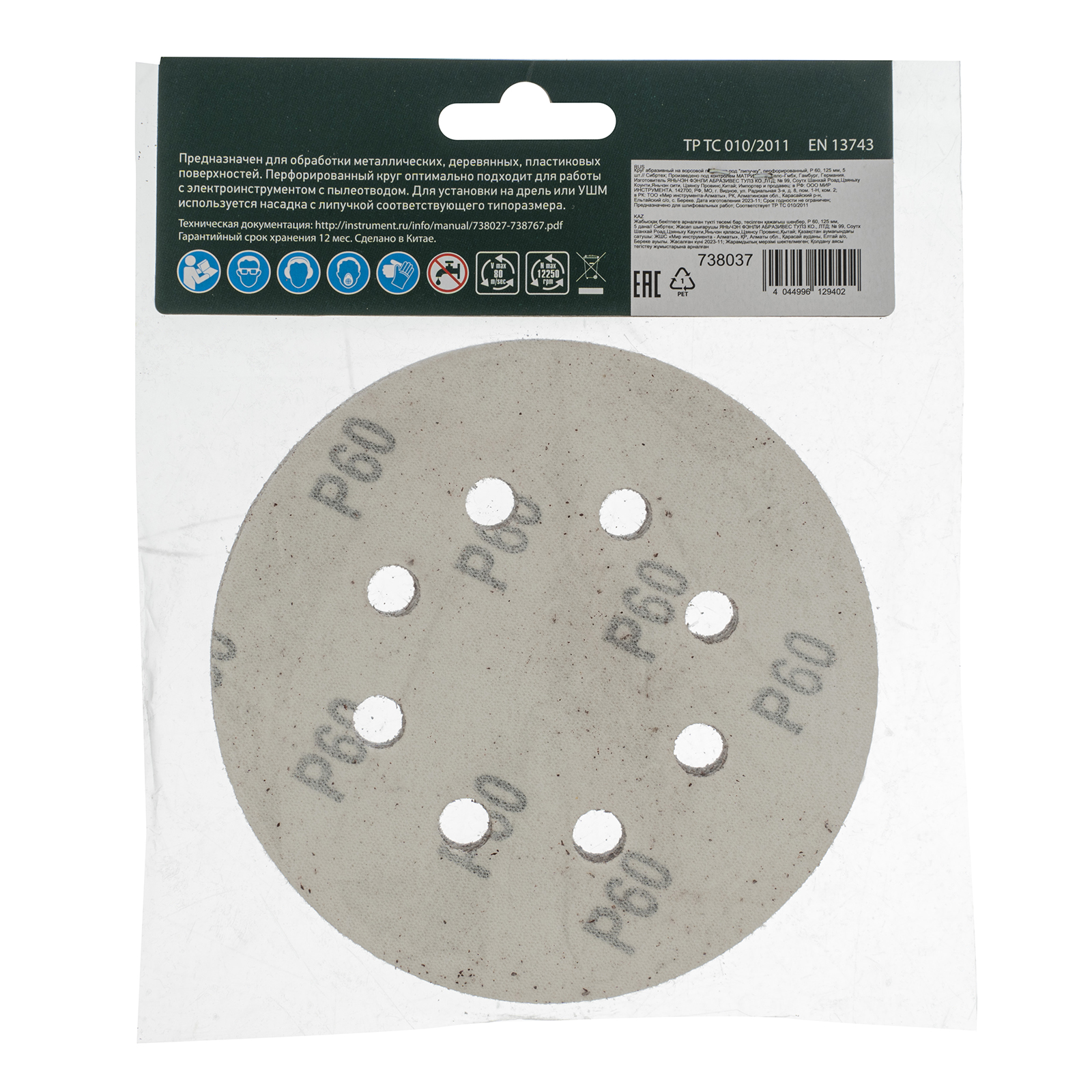 Перфорированный абразивный круг Сибртех 738037 диаметром 125 мм, с крупнозернистым абразивом P 60, на ворсовой подложке под «липучку», 5 шт. в упаковке, используется для сухого чернового шлифования металла, древесины, пластика и других поверхностей. Позволяет избавиться от заусенцев, подходит для зачистки старого покрытия (краски/лака), удаления ржавчины, снятия слоя материала. Круг устанавливается на эксцентриковую (орбитальную) шлифовальную машинку с отводом воздуха или на дрель с помощью опорной насадки.