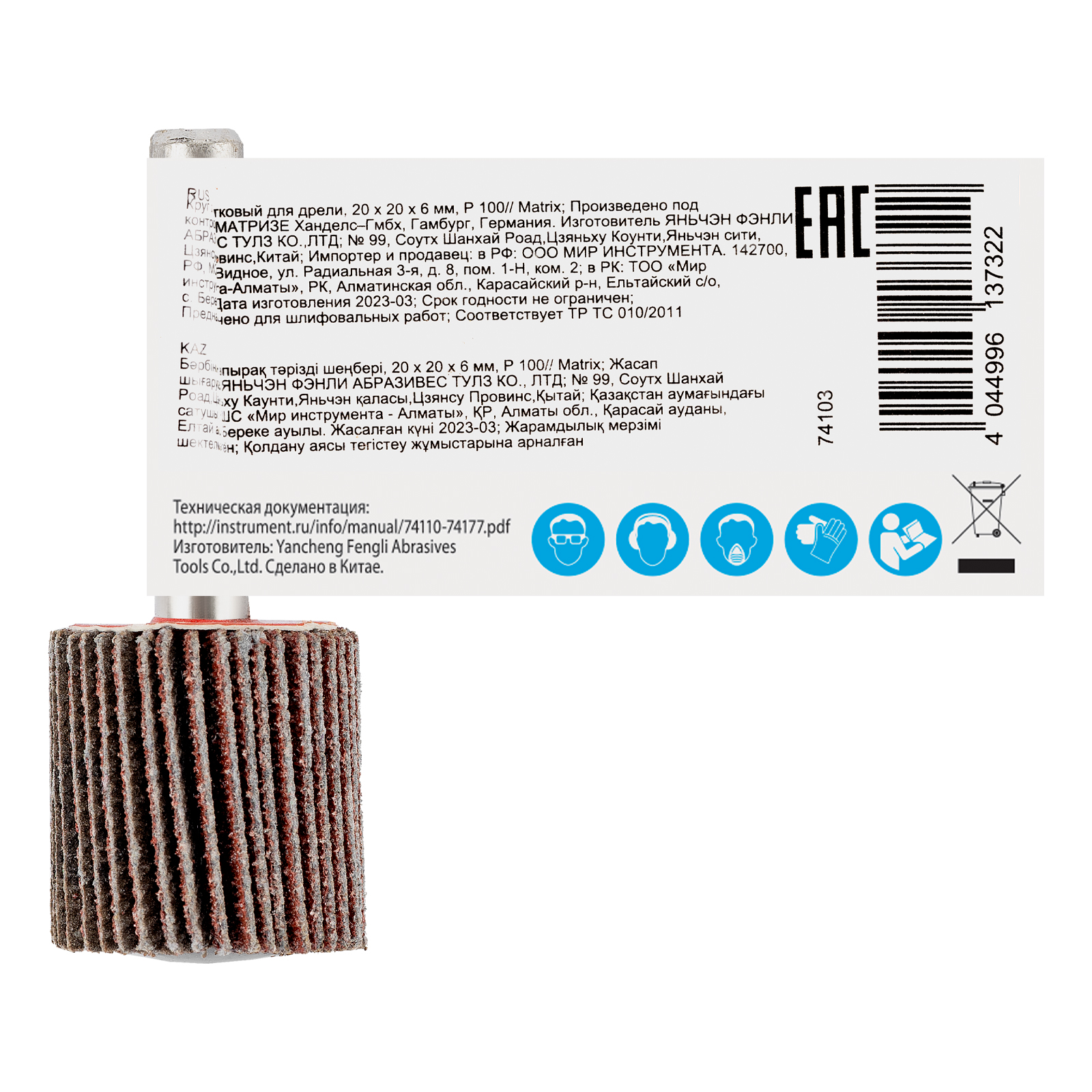 Лепестковый круг Matrix 74103 размером 20 х 20 х 6 мм, с зернистостью P 100, устанавливается в патрон дрели или прямой шлифовальной машины с посадочным диаметром 6 мм и максимальной скоростью вращения 23900 об/мин. Применяется для радиальной шлифовки внутренних и наружных поверхностей. Среднезернистый абразив P 100 успешно справляется с промежуточной обработкой металла и древесины — снятием тонкого слоя лака, краски, ржавчины и заусенцев.