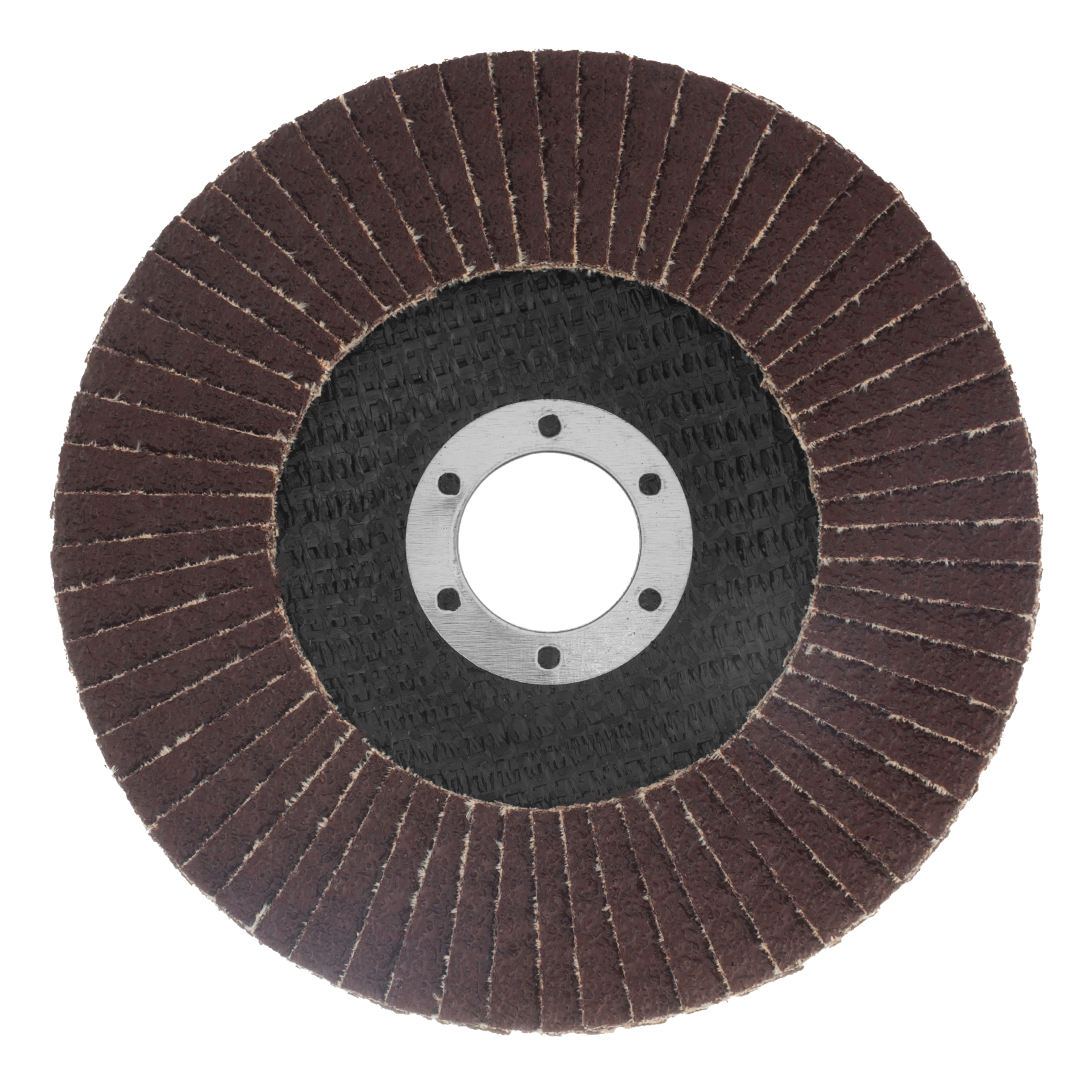 Круг лепестковый торцевой БАЗ КЛТ-1 74012 зернистостью Р36 (50Н), 125 х 22,2 мм, устанавливается в качестве оснастки на фланец УШМ с диаметром посадочного отверстия 22,2 мм. Он используется для грубой (черновой) обработки, торцевого и плоского шлифования из древесины, металла, пластика. С помощью круга можно зачистить сварные швы, острые углы после резки, удалить заусенцы, толстый слой ржавчины и краски, снять фаски и т.д.