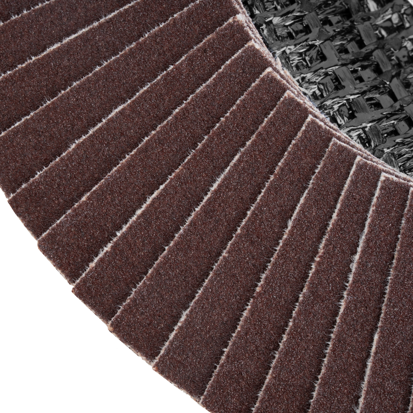 Круг лепестковый торцевой КЛТ-2 740877 зернистостью Р120, 125 х 22,2 мм, устанавливается в качестве оснастки на фланец УШМ с диаметром посадочного отверстия 22,2 мм. Он используется для чистовой обработки, торцевого и плоского шлифования древесины, металла, пластика. С помощью круга можно зачистить сварные швы, обработать заусенцы после резки, удалить налет ржавчины, лак или краску и т.д.