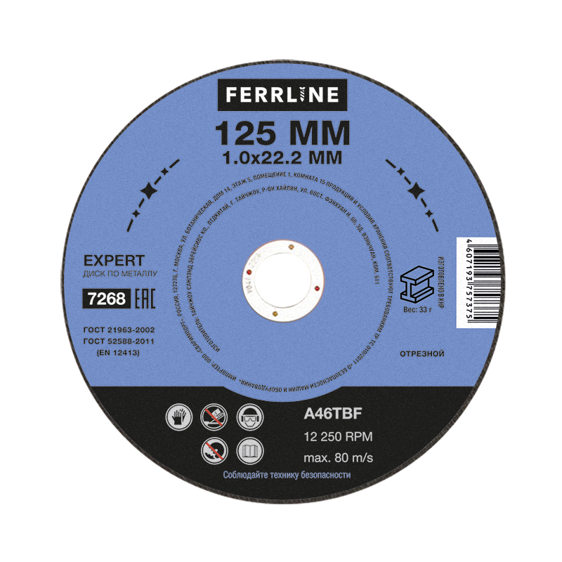 Круг отрезной по металлу FerrLine Expert 125 х 1,0 х 22,2 мм A46TBF