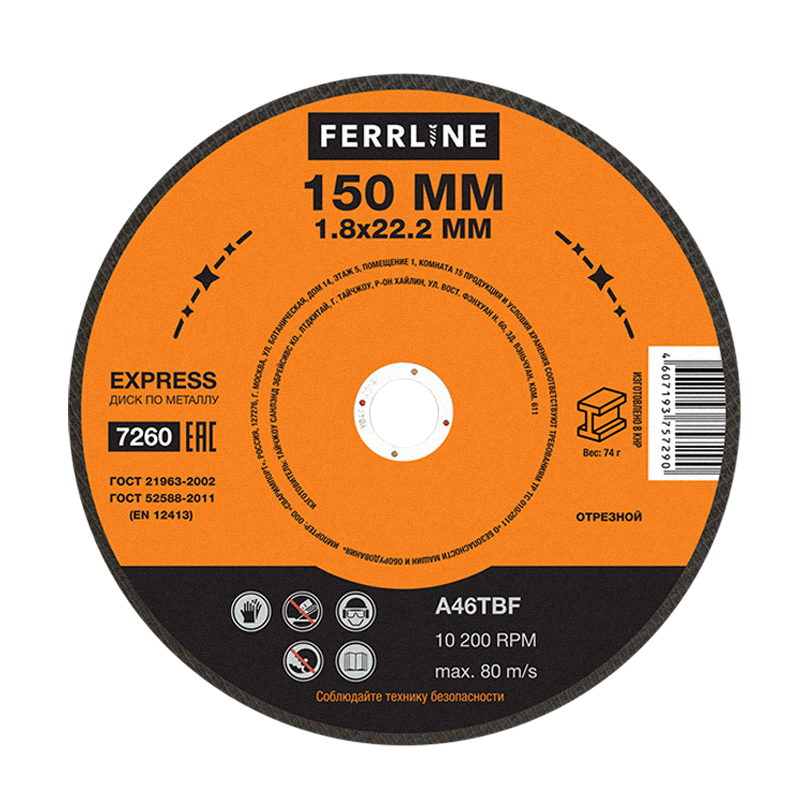 Круг отрезной по металлу FerrLine Express 150 х 1,8 х 22,2 мм A46TBF