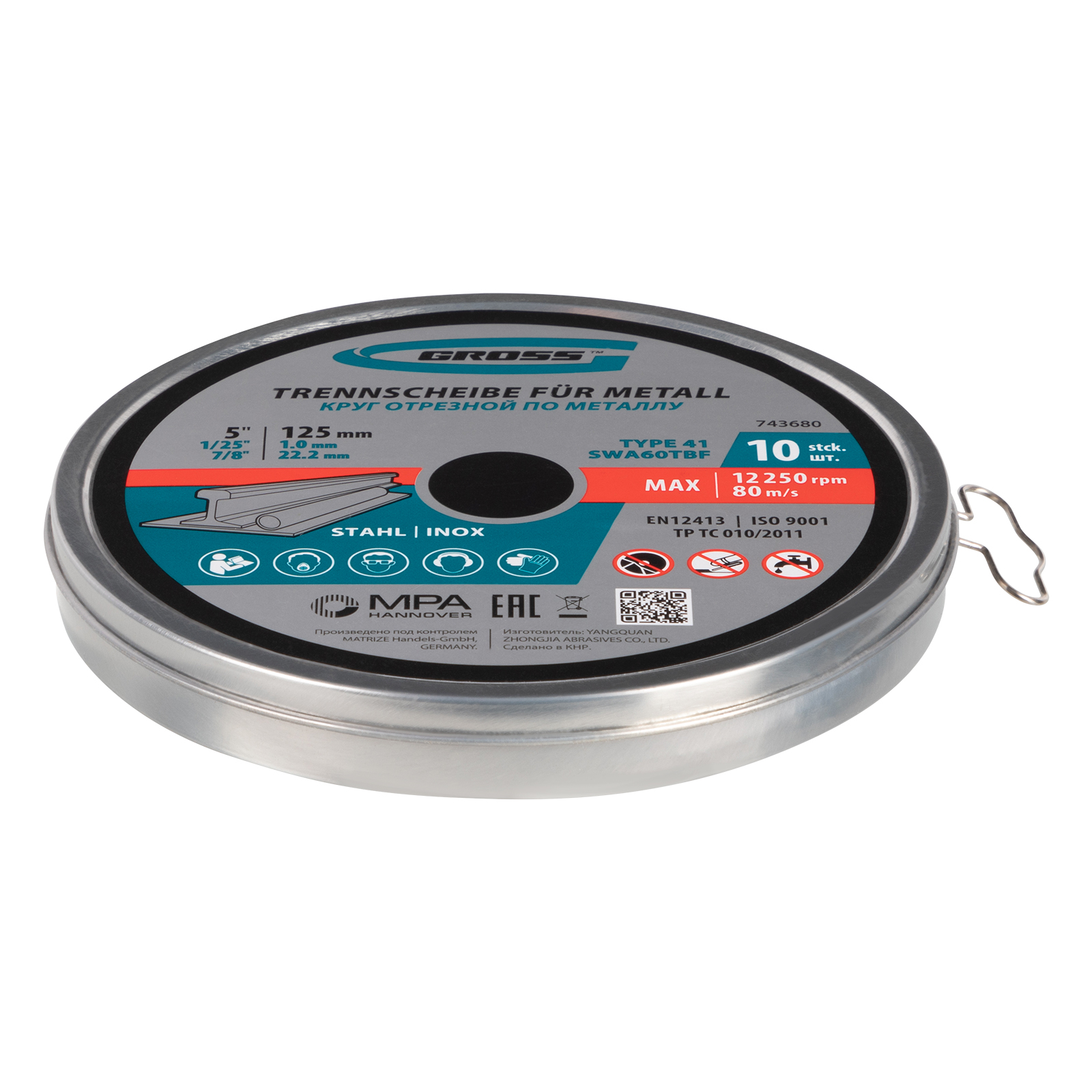 Круг отрезной по металлу, 125 х 1,0 х 22,2 мм, SWA60TBF, в метал.банке, 10 шт. Gross
