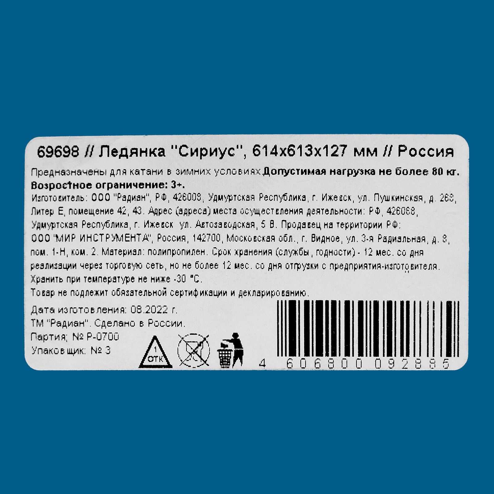 Ледянка «Сириус» 69698 размером 614 х 613 х 127 предназначена для зимнего отдыха. Используется для скоростного спуска с ледяных горок. По бокам имеются удобные ручки для комфортного и безопасного использования. Ледянка обеспечивает веселое времяпрепровождение на свежем воздухе.