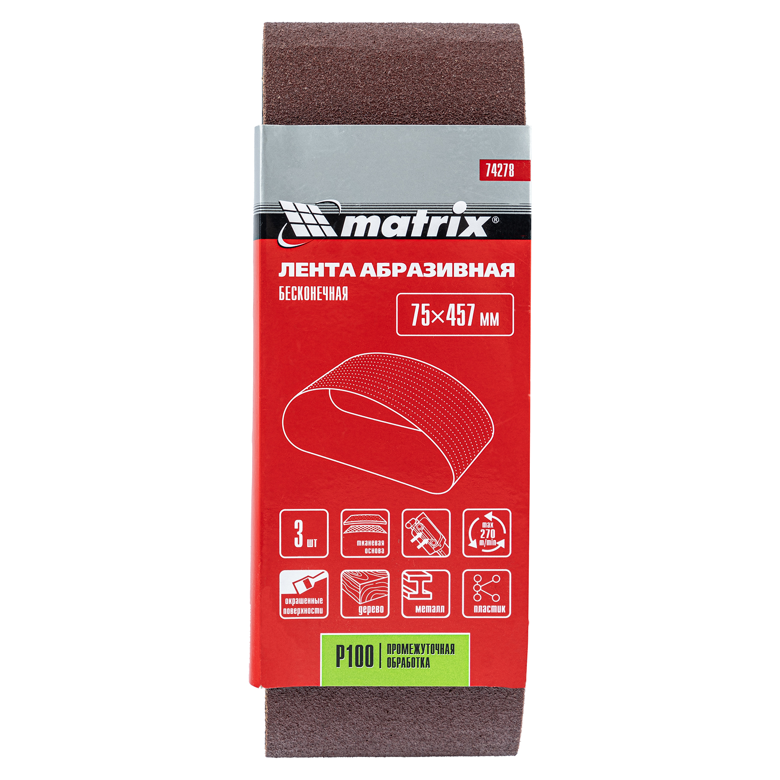 Лента абразивная бесконечная, P 100, 75 х 457 мм, 3 шт Matrix