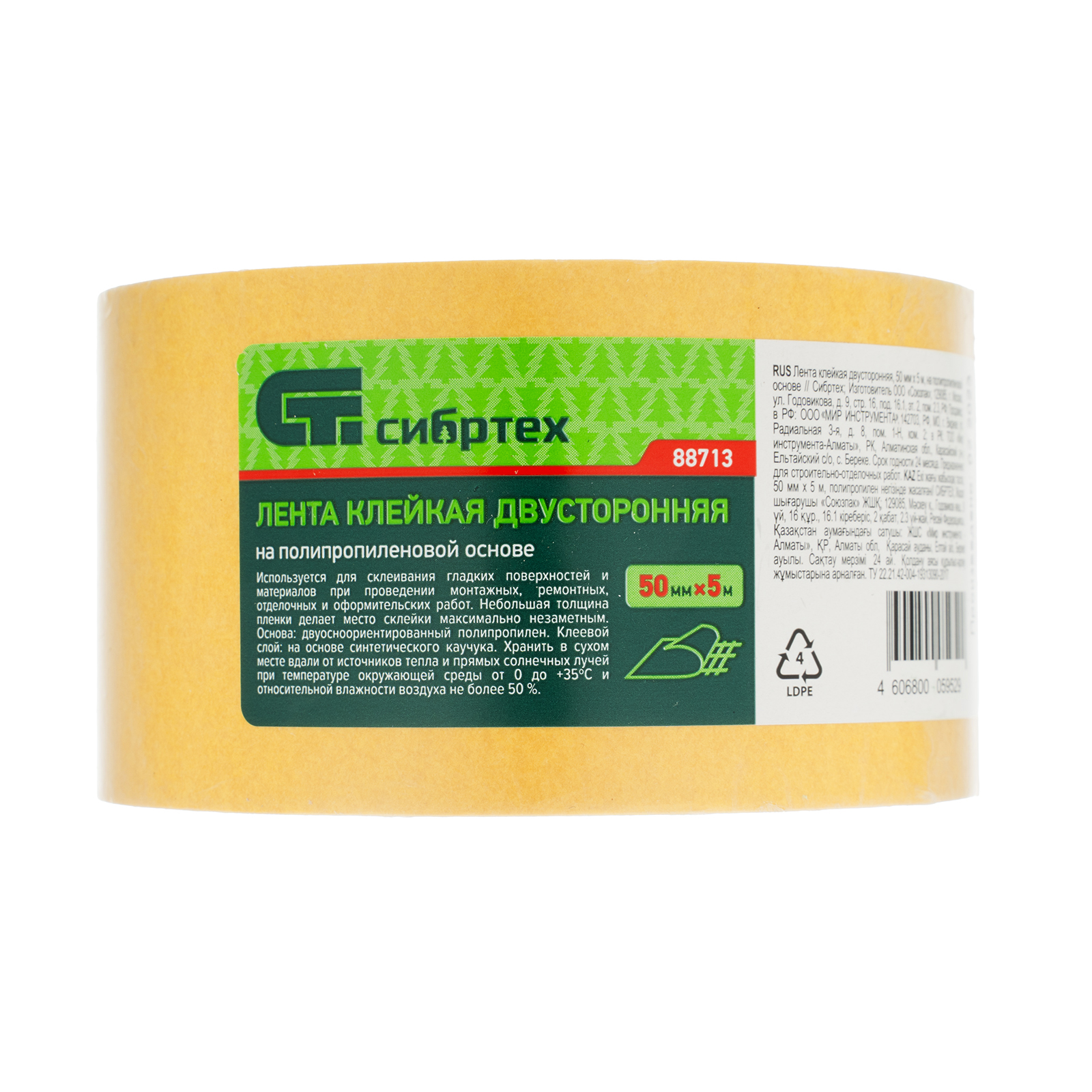 Лента клейкая двусторонняя, 50 мм х 5 м, на полипропиленовой основе Сибртех
