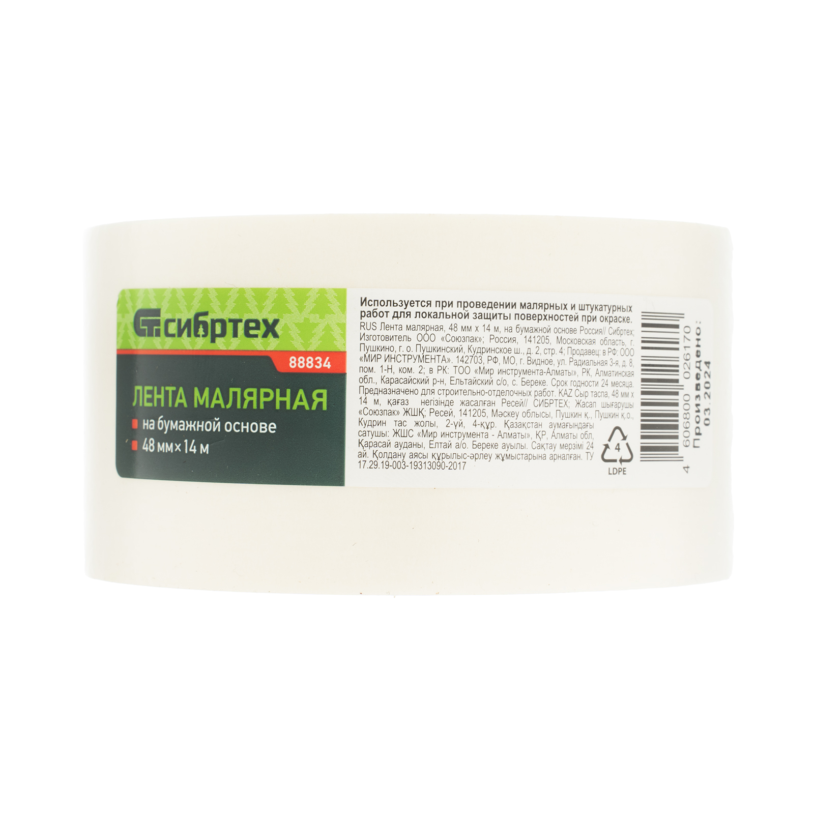 Малярная лента Сибртех 88834 шириной 48 мм и длиной намотки 14 м, на бумажной основе, пригодится для внутренних малярных работ с ЛКМ любого типа, а также для склеивания книг, альбомов и других бумажных предметов. Повышает качество окрашивания, т.к. предотвращает растекание краски, при этом надежно клеится и без труда удаляется, не оставляя следов на поверхностях.