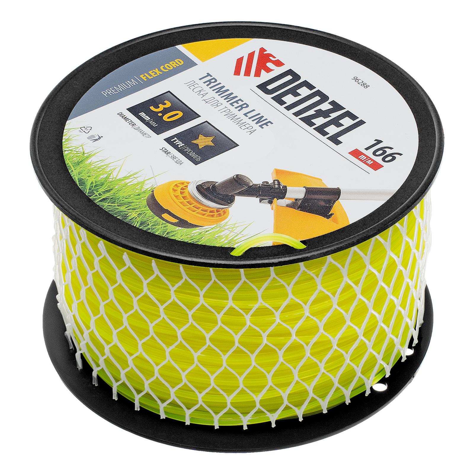 Леска Denzel FLEX CORD 96288 с сечением «звезда», диаметром 3,0 мм и длиной 166 м, на DIN-катушке, предназначена к использованию в бензиновых триммерах с объемом двигателя 25-52 см3. Применяется для ухода за газоном, скашивает даже растительность с жесткими и толстыми стеблями. Пригодится владельцам дачных участков, а также работникам коммунальных служб.
