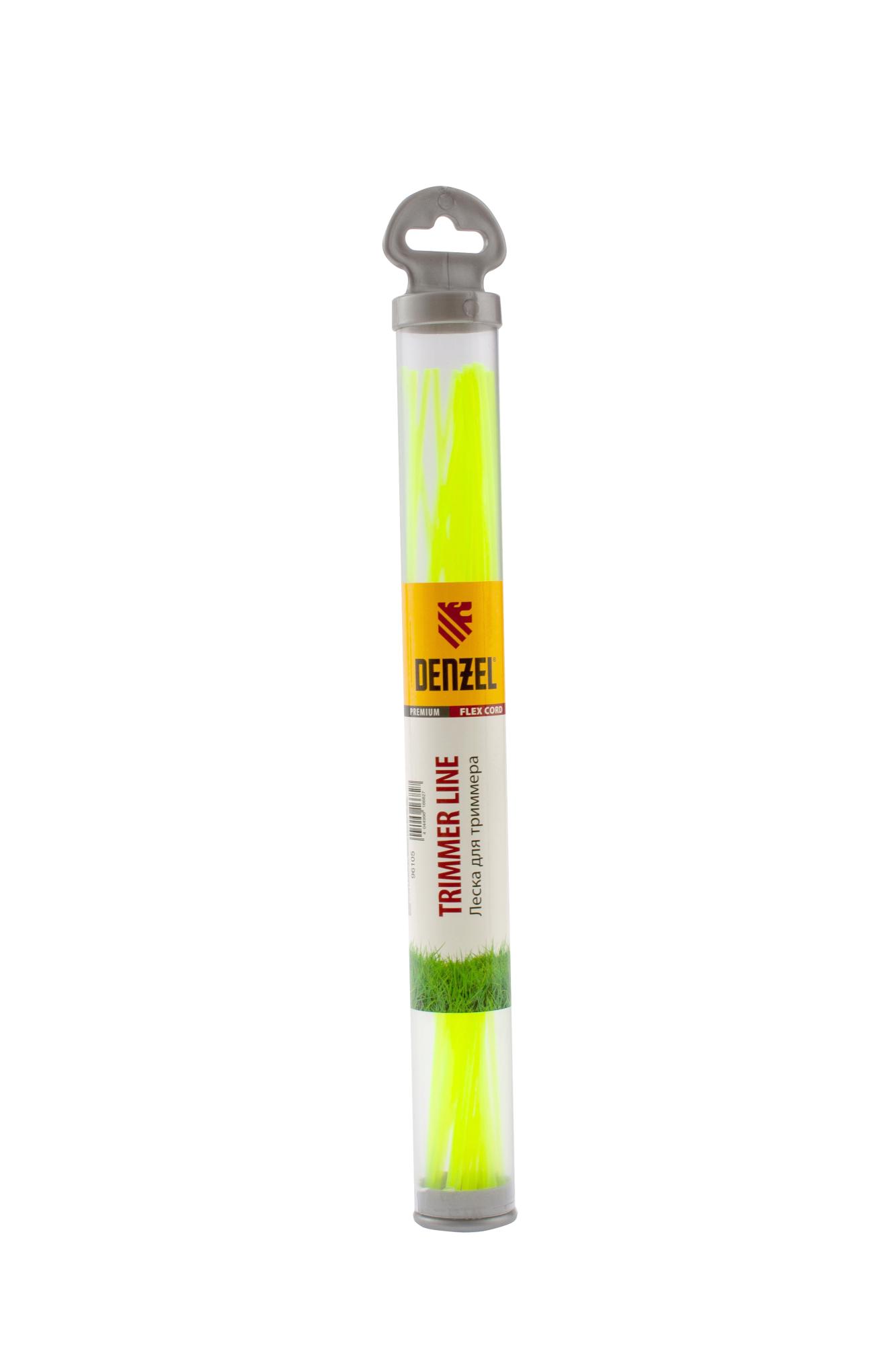 Круглая нарезанная леска для триммера Denzel FLEX CORD 96105 диаметром 2,4 мм и длиной 30 см, 20 шт. в тубусе, заправляется в триммерную головку и используется для скашивания газонной или густой травы, а также сорняков с толстыми стеблями. Подходит для электротриммеров мощностью 1-1,4 кВт и бензотриммеров.