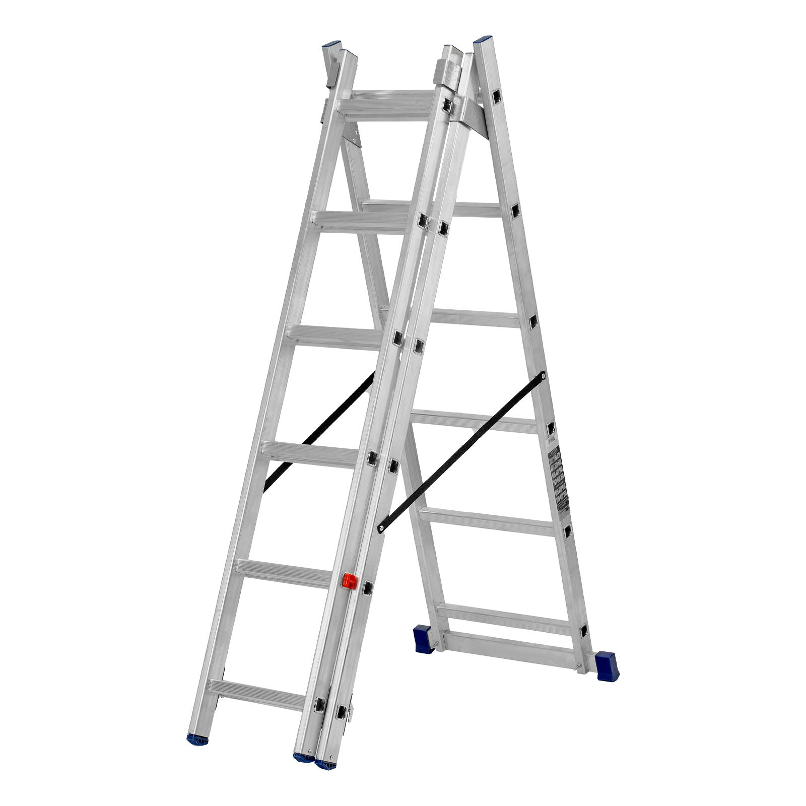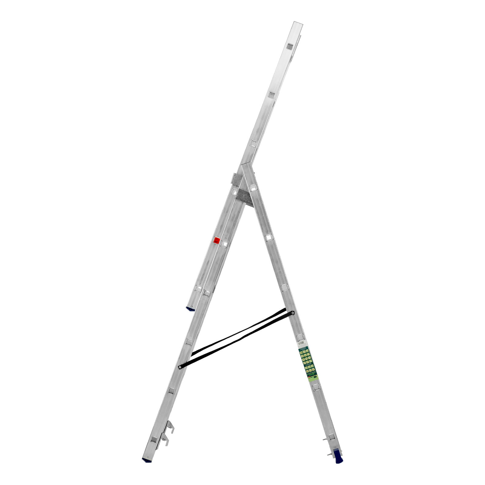 - Многофункциональность — лестница может использоваться в 3 различных вариациях — в качестве стремянки (с двумя расставленными и одной выдвинутой вверх секцией), двухсторонней стремянки (две секции расставлены, третья демонтирована) и приставной лестницы.