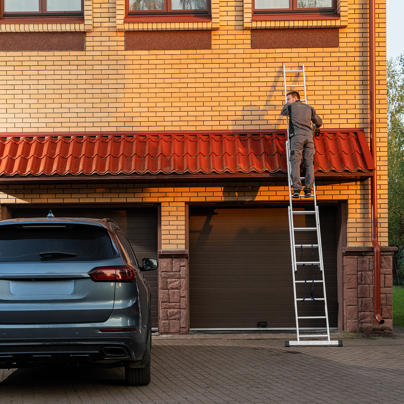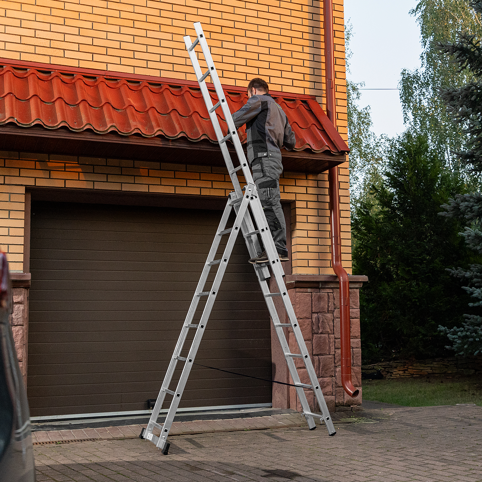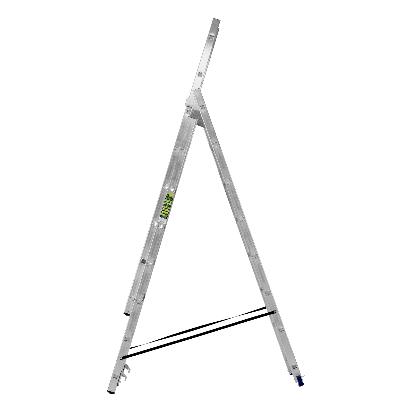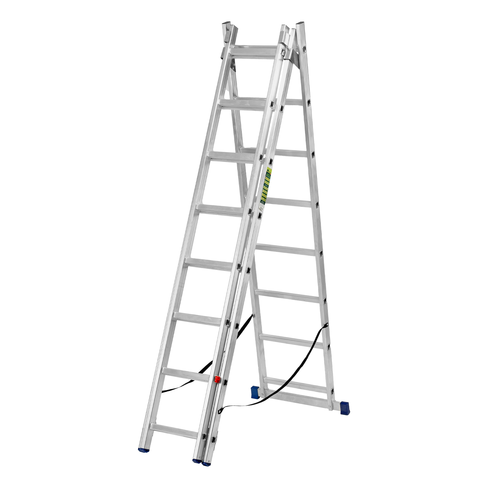 - Многофункциональность — лестница может использоваться в 3 различных вариациях — в качестве стремянки (с двумя расставленными и одной выдвинутой вверх секцией), двухсторонней стремянки (две секции расставлены, третья демонтирована) и приставной лестницы.