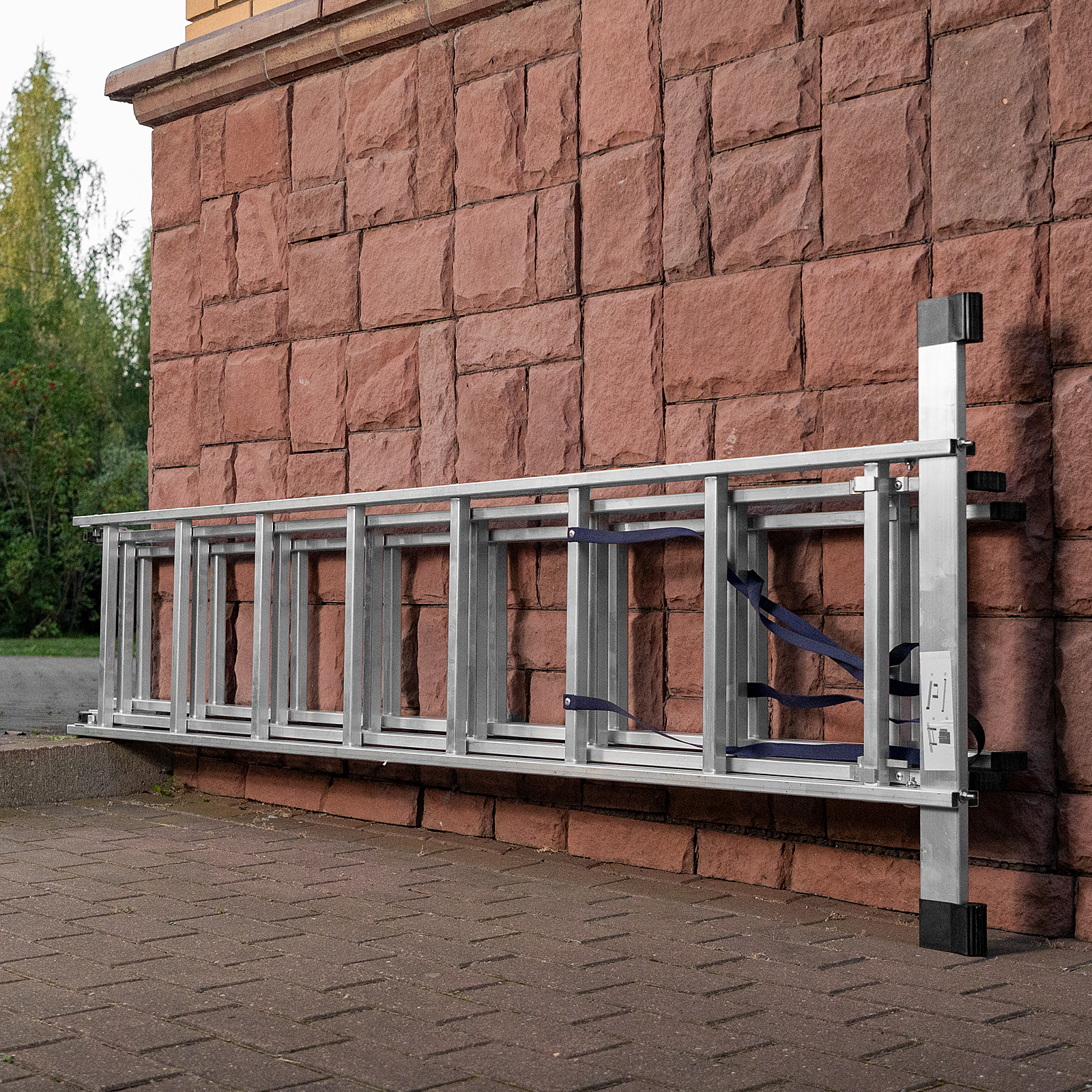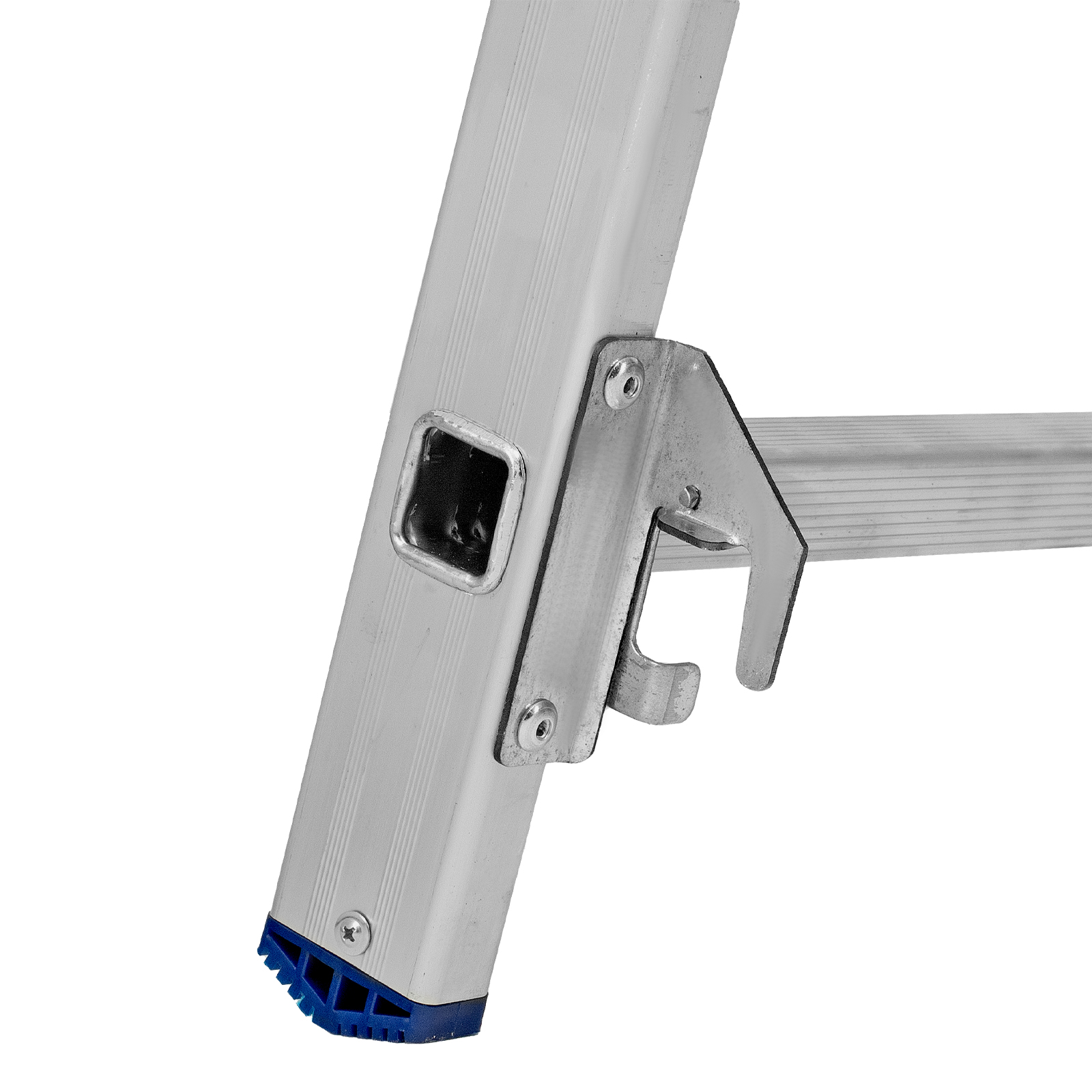 - Устойчивость — лестница оснащена съемным стабилизатором, выравнивающим ее положение на горизонтальных поверхностях.