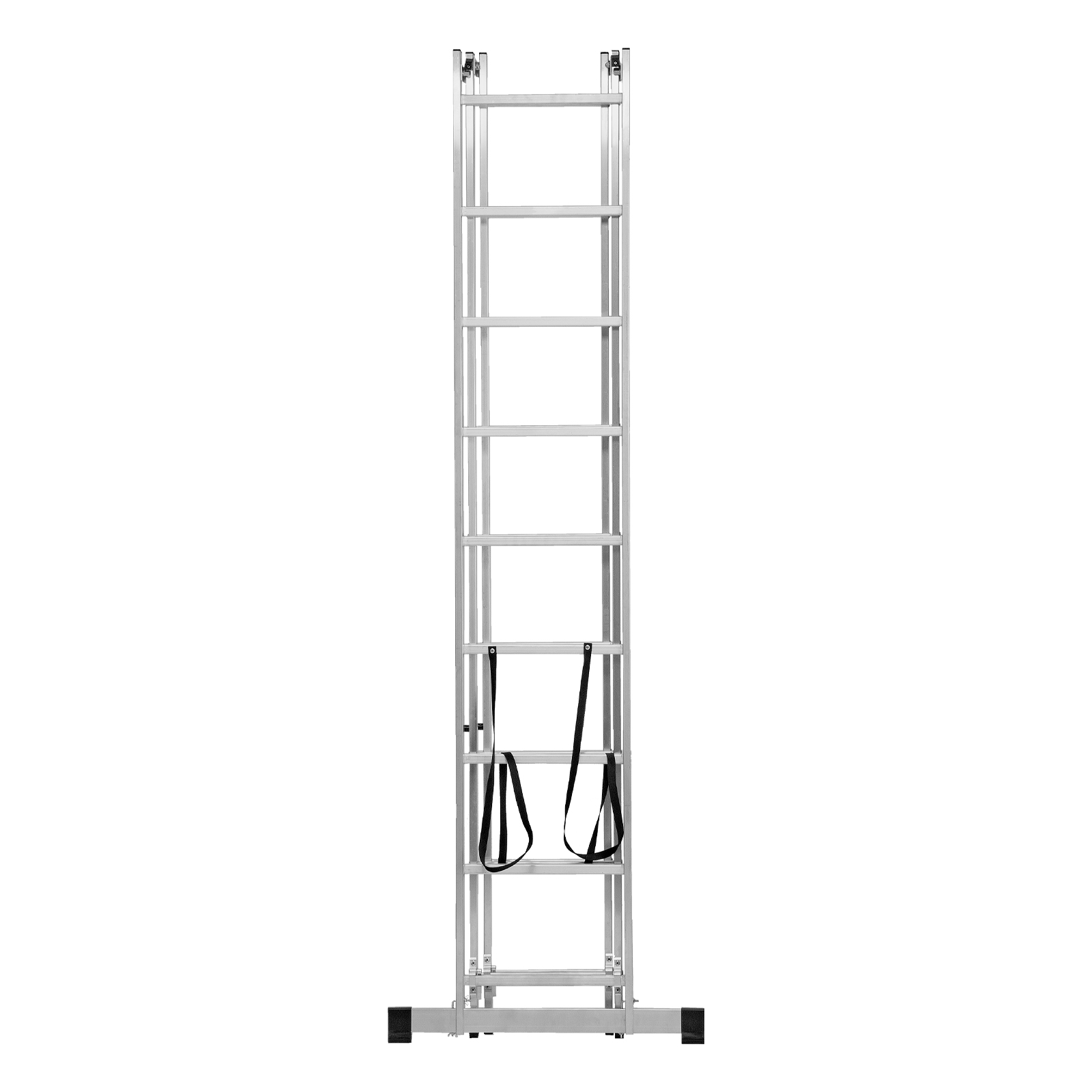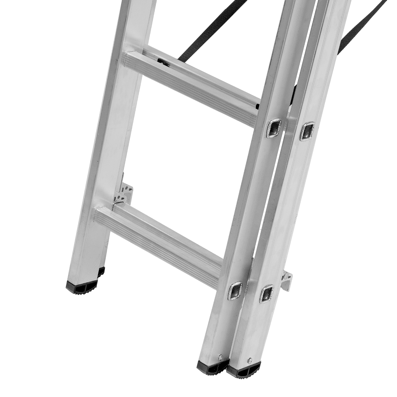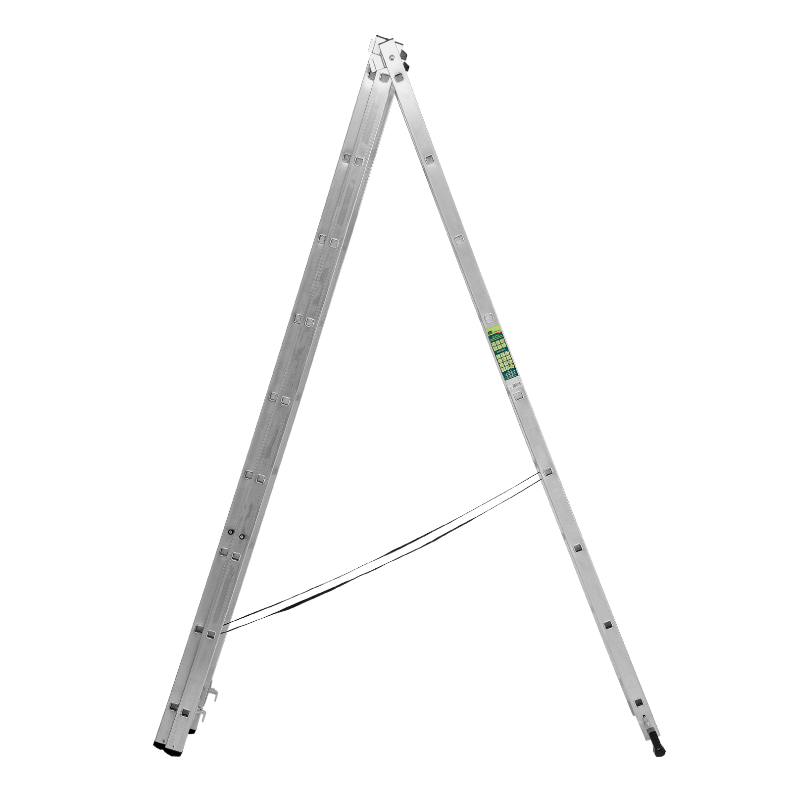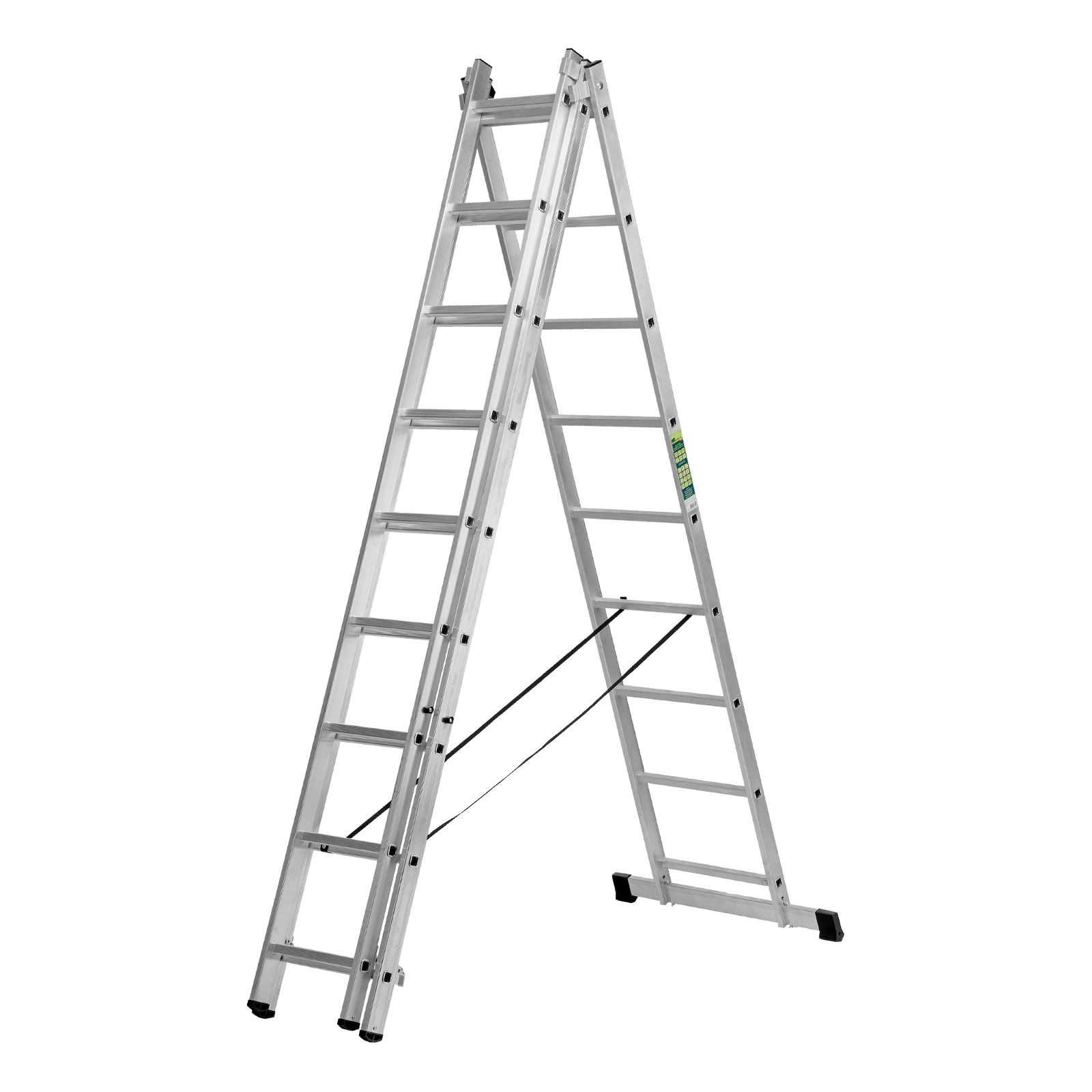 - Многофункциональность — лестница может использоваться в 3 различных вариациях — в качестве стремянки (с двумя расставленными и одной выдвинутой вверх секцией), двухсторонней стремянки (две секции расставлены, третья демонтирована) и приставной лестницы.