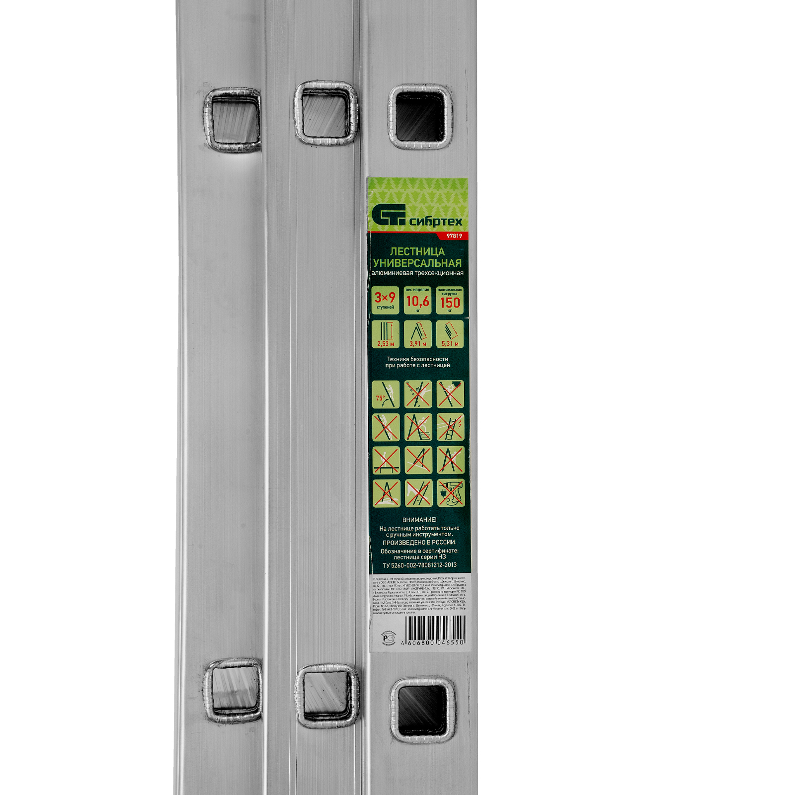 Лестница, 3 х 9 ступеней, алюминиевая, трехсекционная, Сибртех
