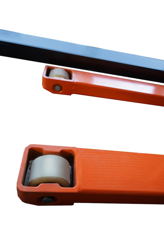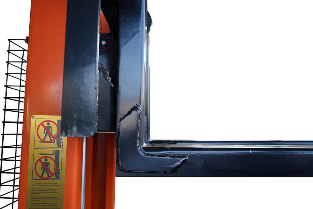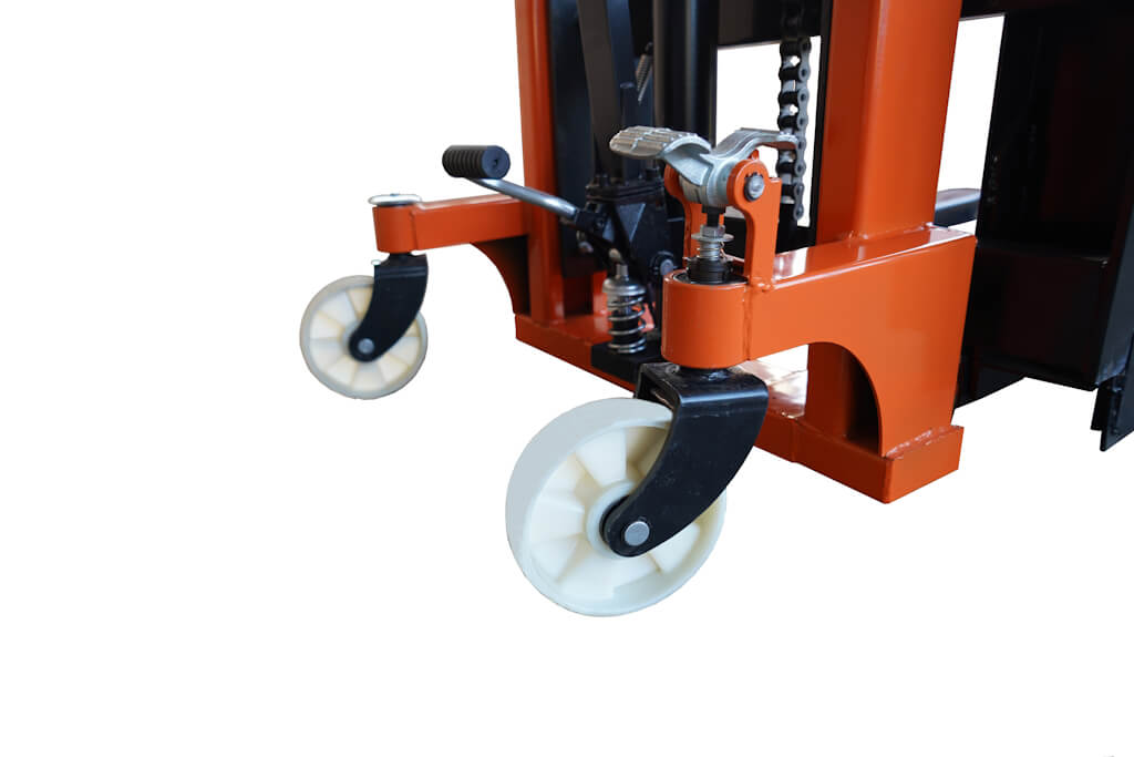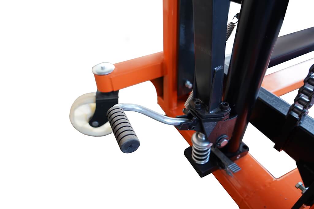 Вилы поднимаются за счет цепной передачи и мощного гидравлического цилиндра, которые приводятся в движение ручным рычагом с рукояткой переключения режимов или складной ножной педалью.